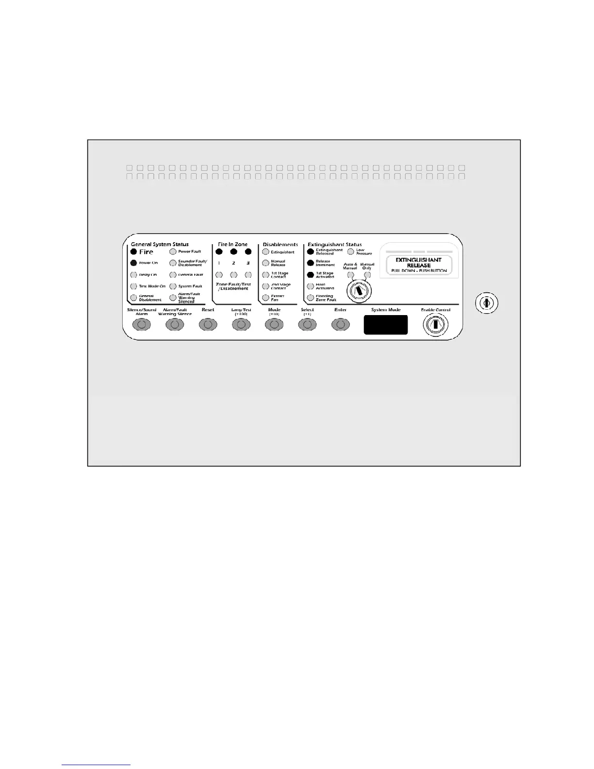 The fascia is divided into two sections. A standard EN54-2 control and indicating equipment