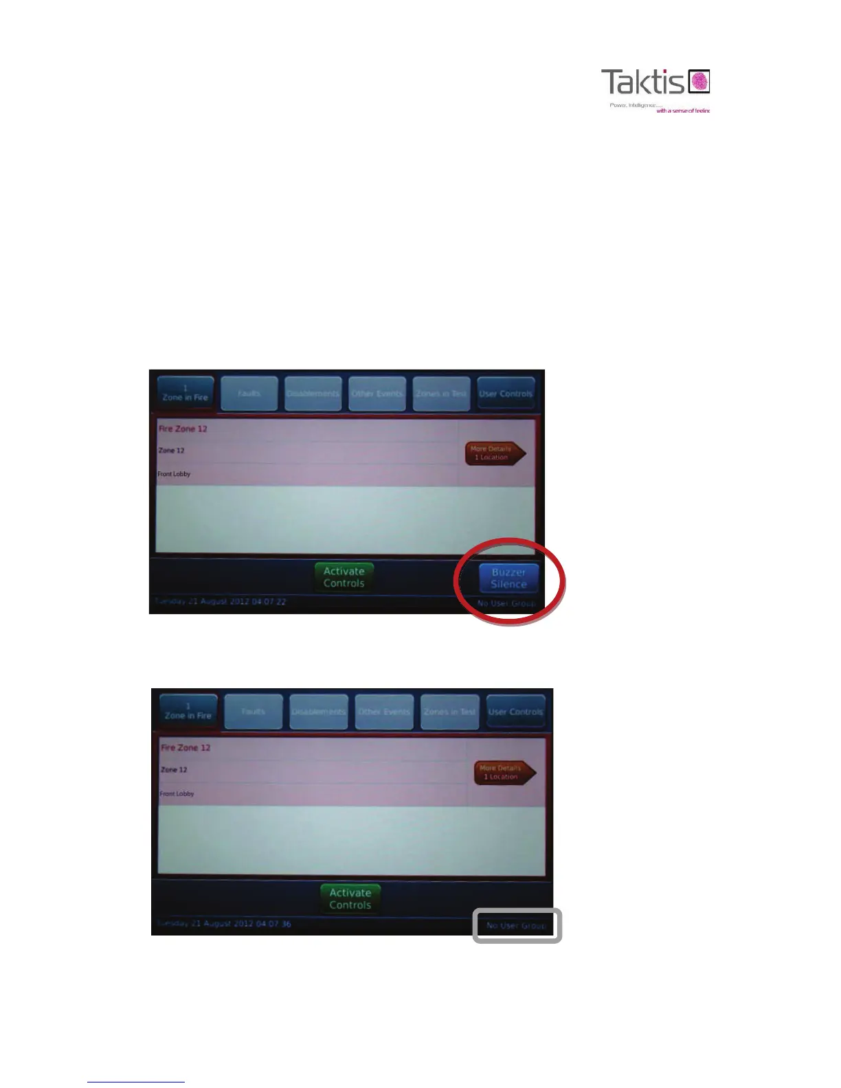 The Buzzer Silence command silences the internal buzzer of the Taktis Fire Control Panel. No other sounder