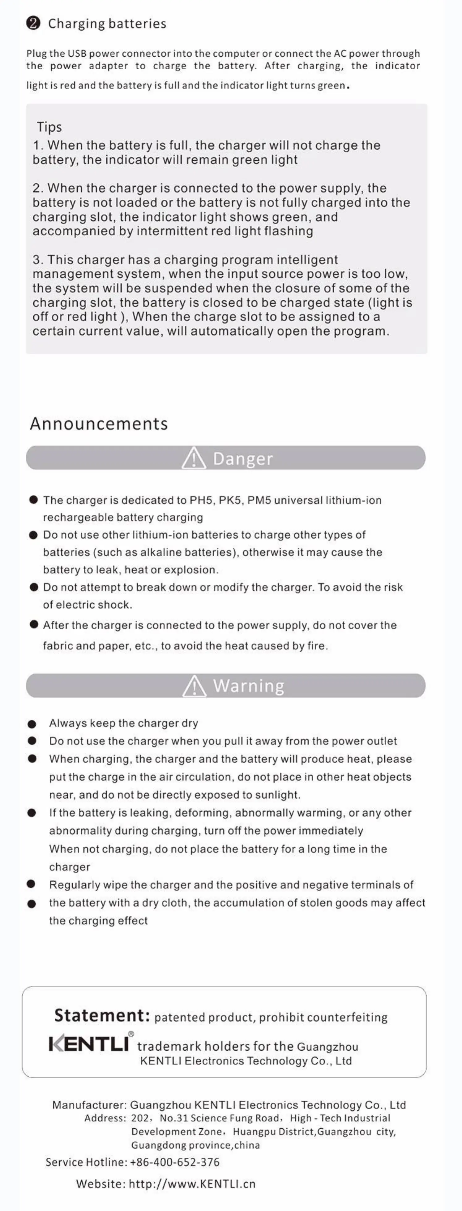 • The charger is dedicated to PH5, PK5, PM5 universal lithium-ion