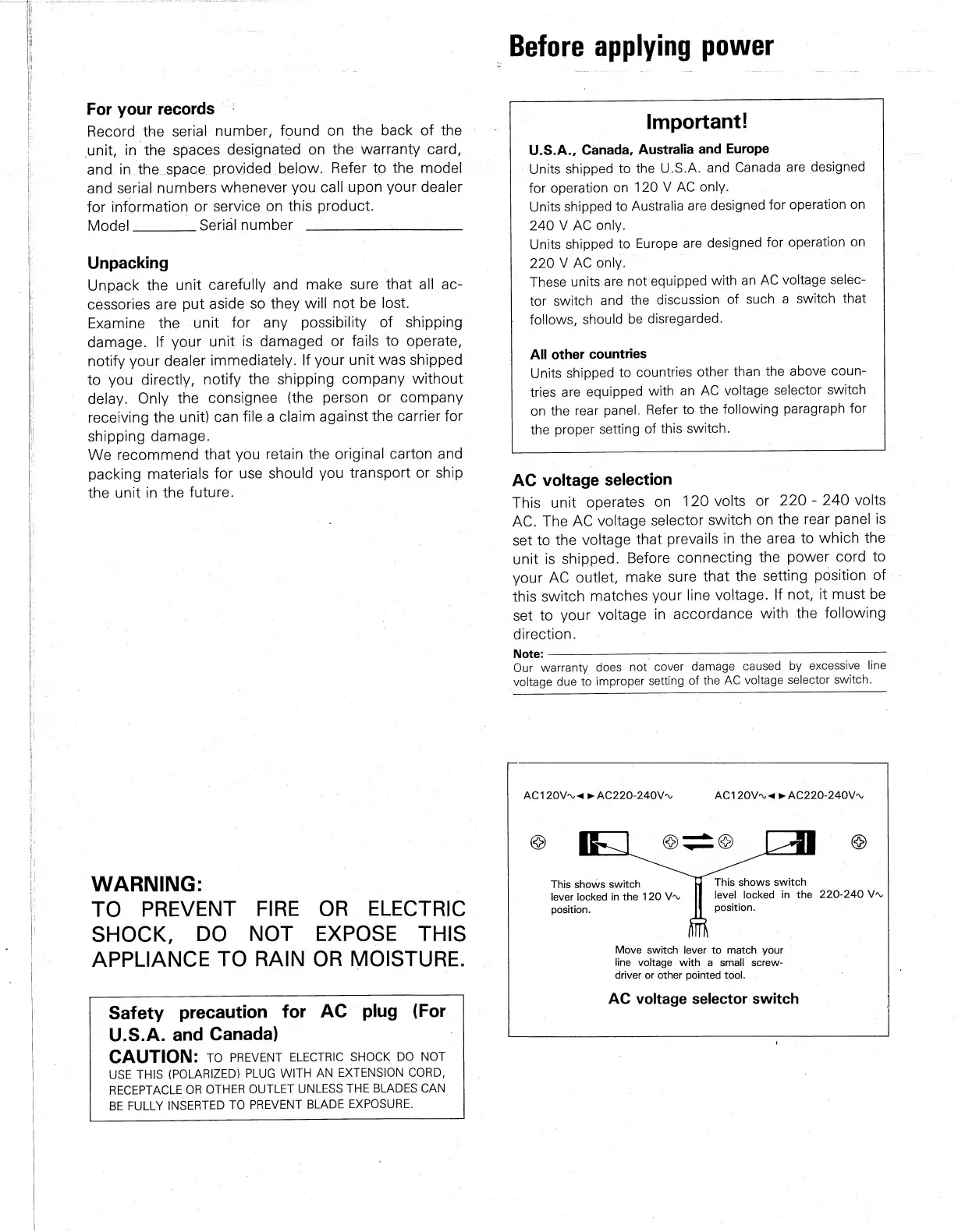 Kenwood Basic M1D - Before Applying Power; Unpacking and Inspection; AC Voltage Selection