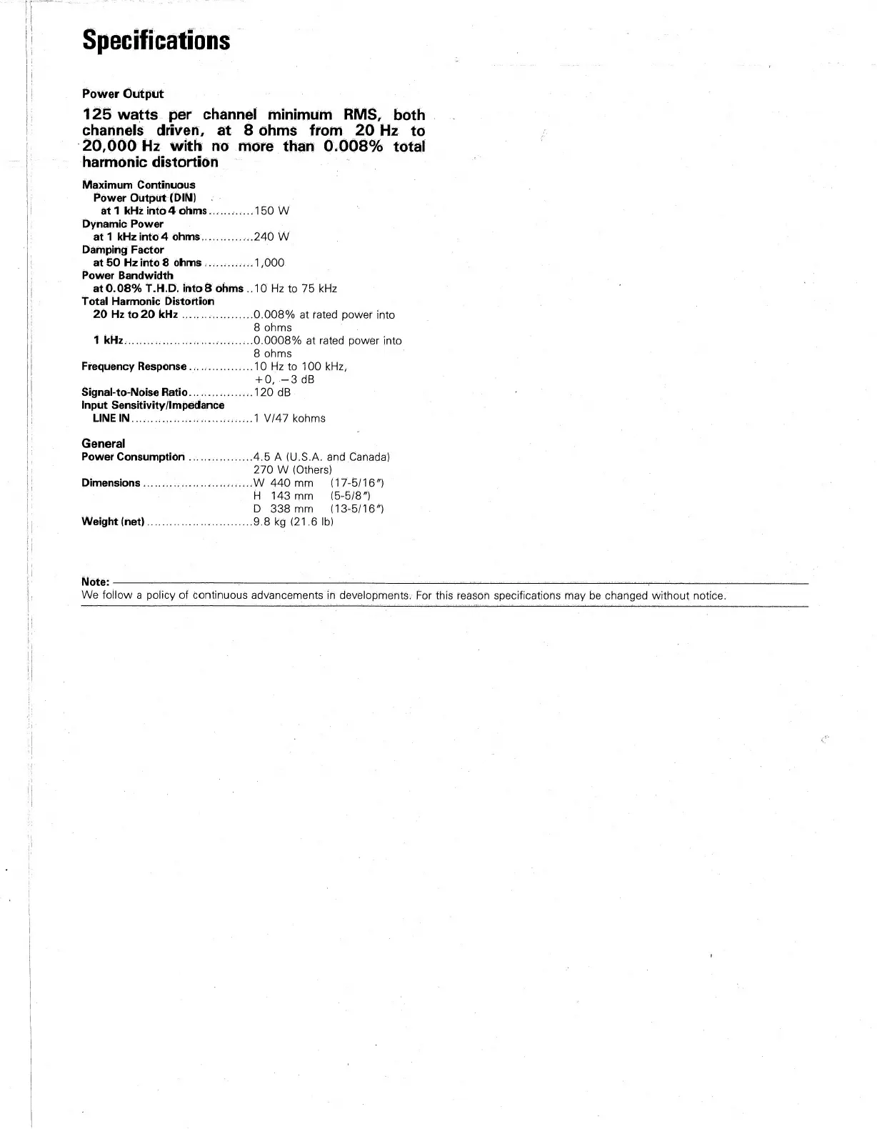 Kenwood Basic M1D - Specifications; Power Output Details; General Technical Data