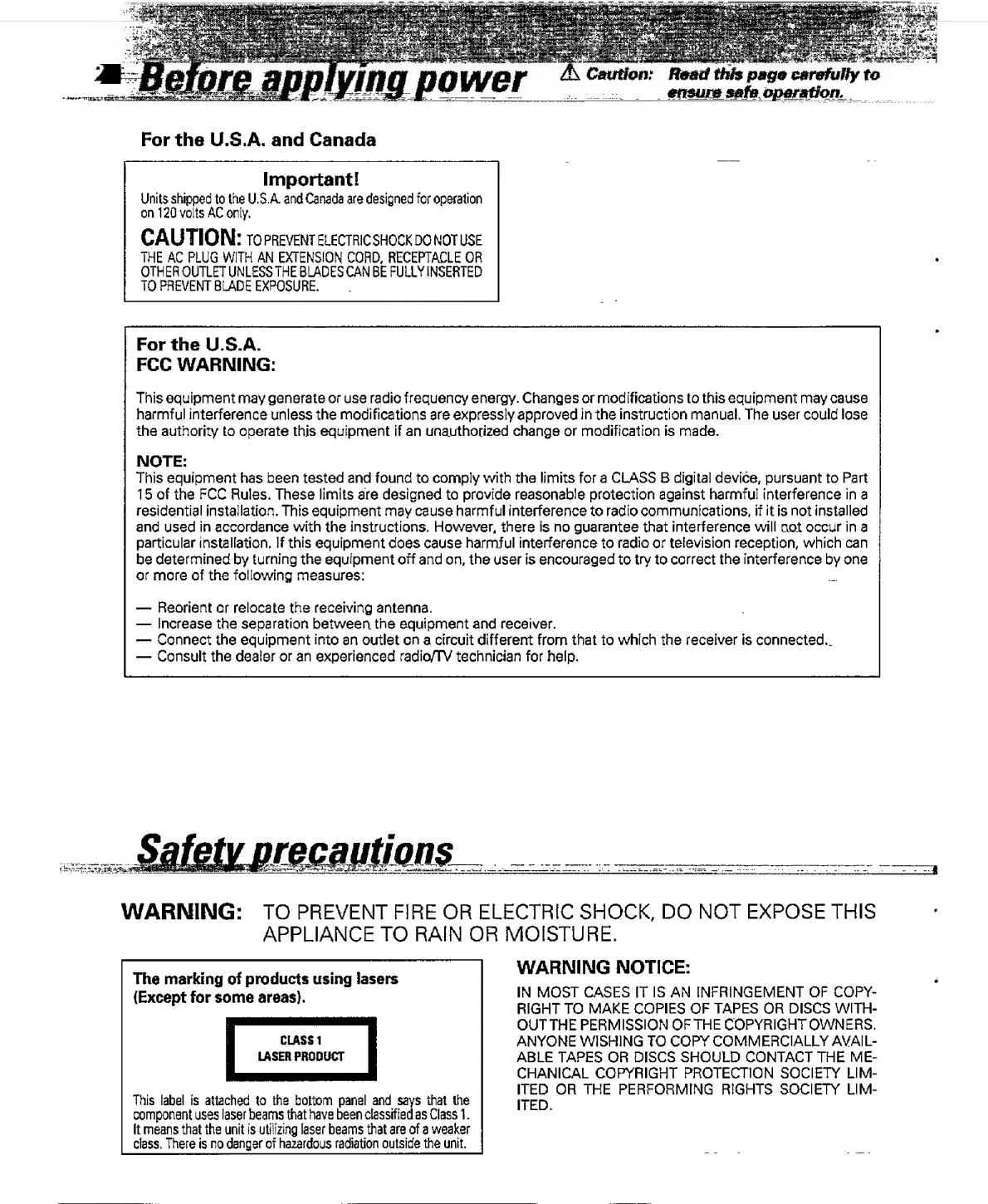 Kenwood DPC-741 - Before Applying Power; Regional Power and FCC Information; Safety Precautions; General Safety Warnings