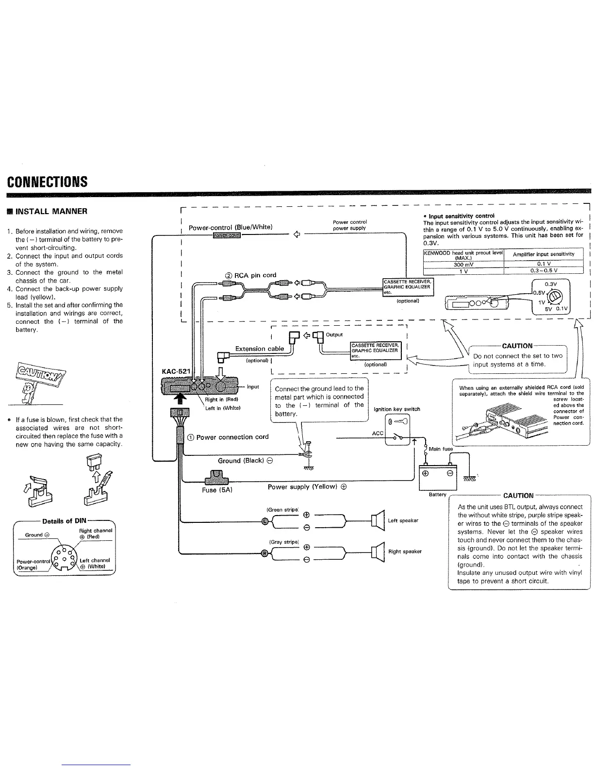 Kenwood KAC-521 - Wiring and Connections; Installation Manner and Wiring Steps; Input Sensitivity Control; Speaker Connection and Safety