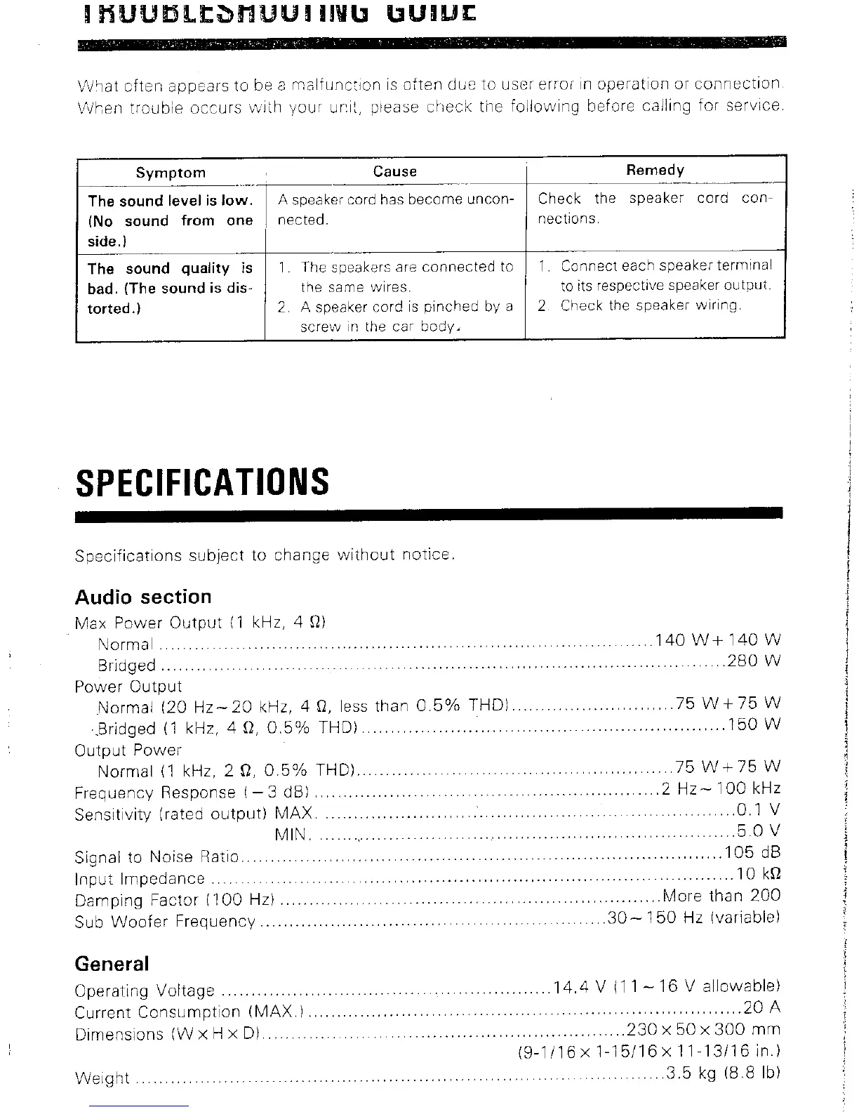 Kenwood KAC-821 - Troubleshooting Guide; Specifications; Audio Section; General