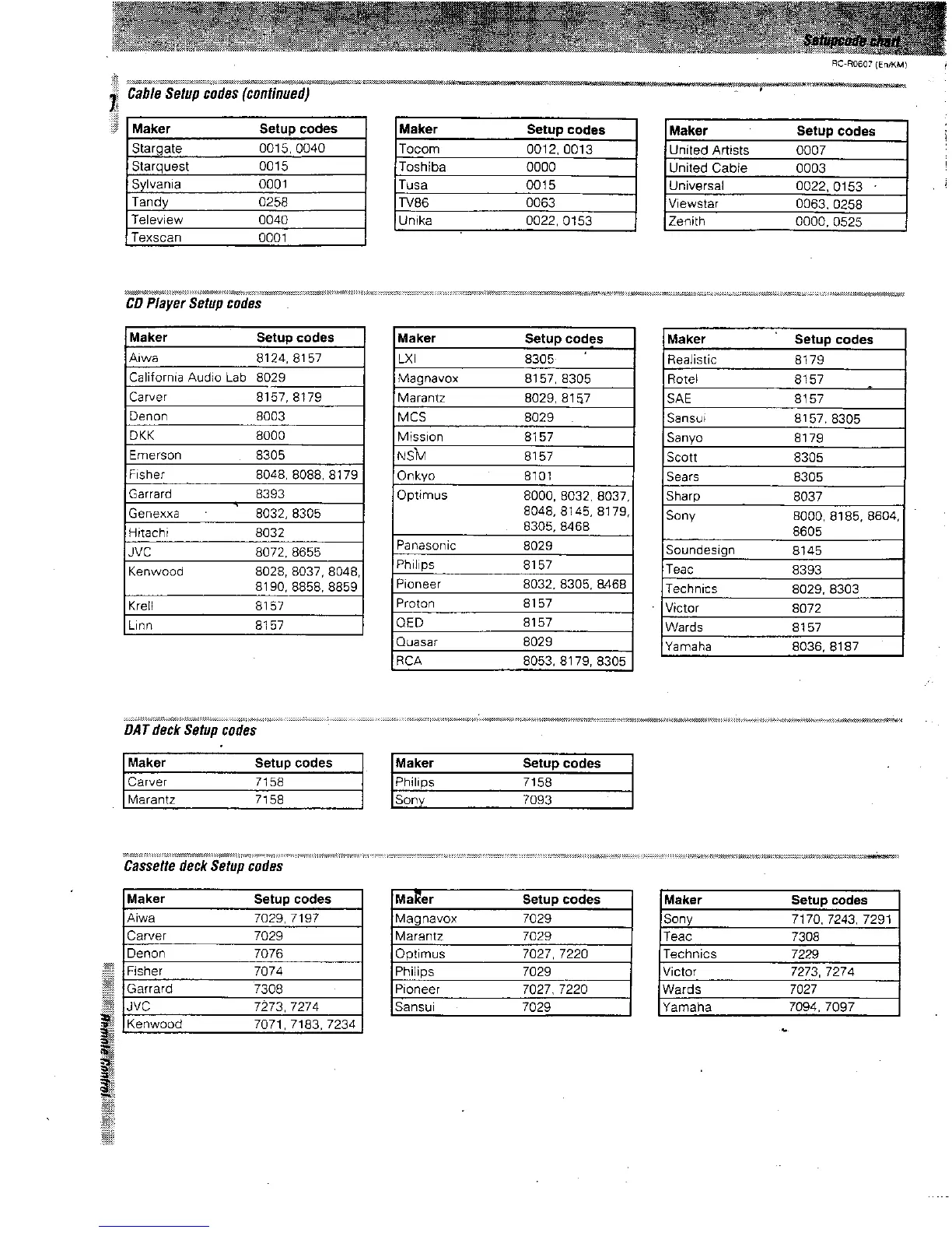 Kenwood RC-R0607 - CD Player Setup Codes; DAT Deck Setup Codes; Cassette Deck Setup Codes
