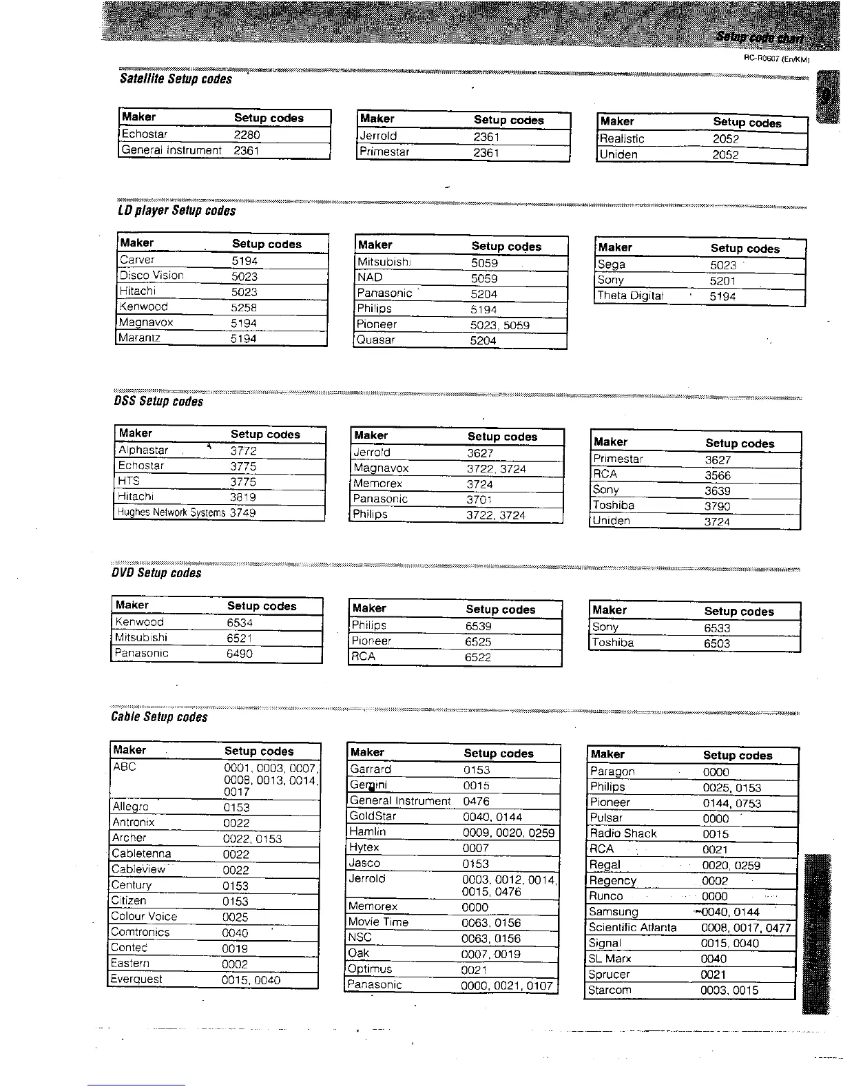 Kenwood RC-R0607 - Satellite Setup Codes; LD Player Setup Codes; DSS and DVD Setup Codes; Cable Setup Codes