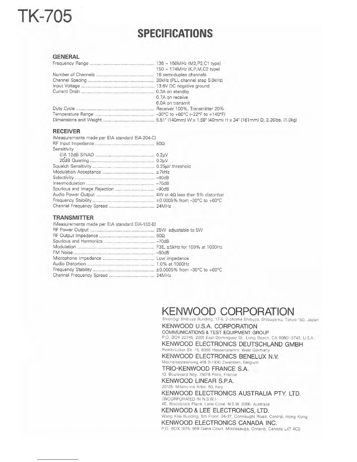 Kenwood TK-705 - Specifications; General, Receiver, and Transmitter Specs