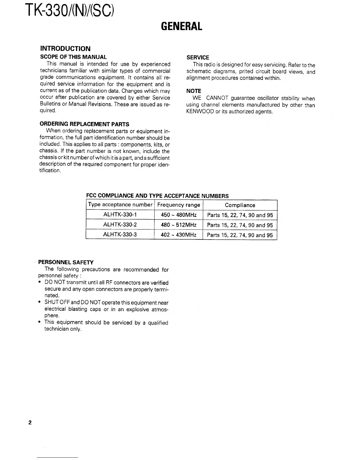 Kenwood TK330 - General; Introduction; Personnel Safety