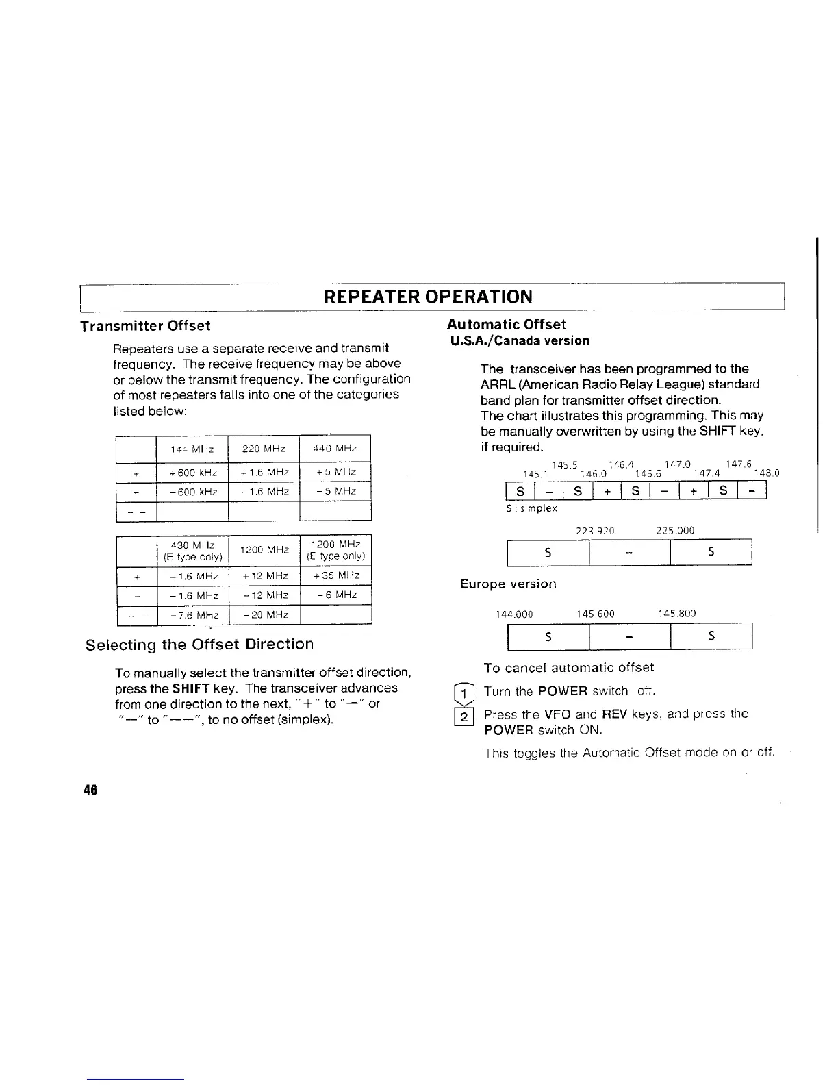 Kenwood TM-742A/E - REPEATER OPERATION; Transmitter Offset; Selecting the Offset Direction; Automatic Offset (U.S.A.;Canada version)
