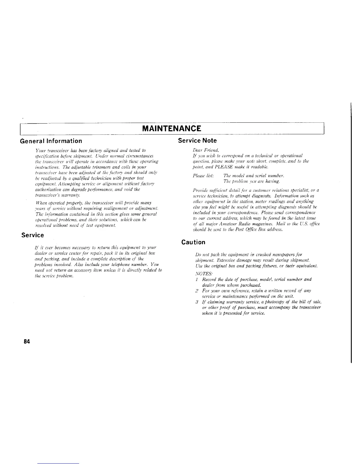 Kenwood TM-742A/E - MAINTENANCE; General Information; Service Note; Caution