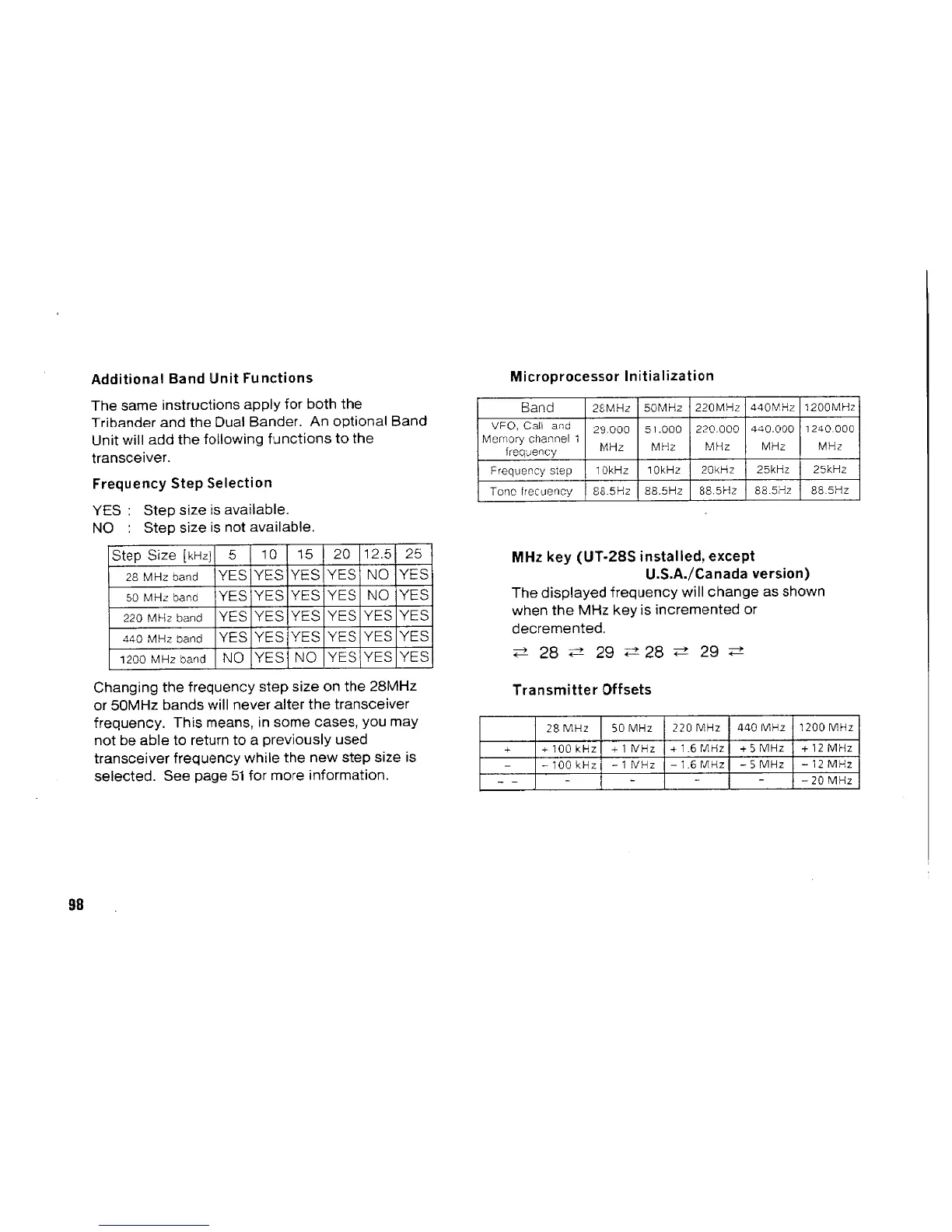 Kenwood TM-742A/E - Additional Band Unit Functions; Frequency Step Selection; Microprocessor Initialization; Mhz Key;Transmitter Offsets