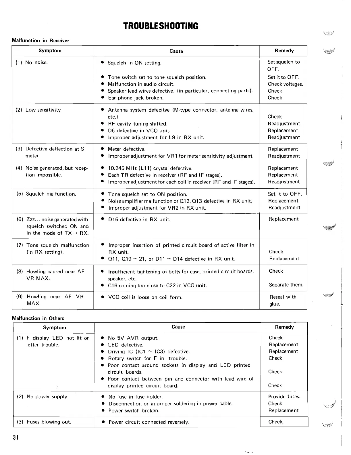 Improper adjustment for each coil in receiver (RF and IF stages).
