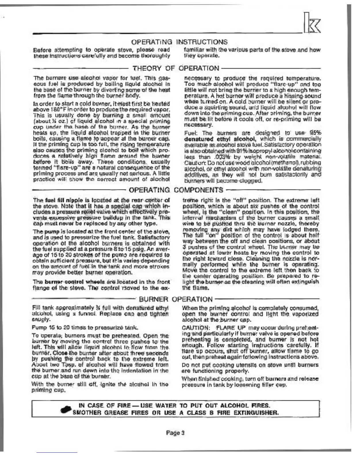 Kenyon 206 - Operating Instructions; Stove Operation Principles; Burner Operation Steps; Fire Safety and Extinguishing