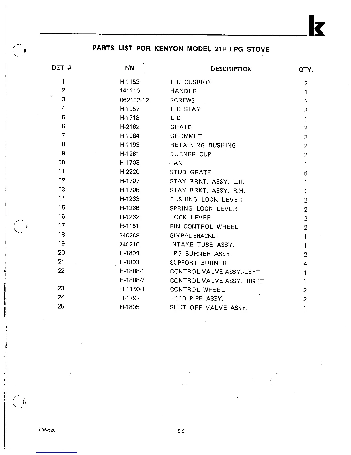Kenyon 219 - Parts List