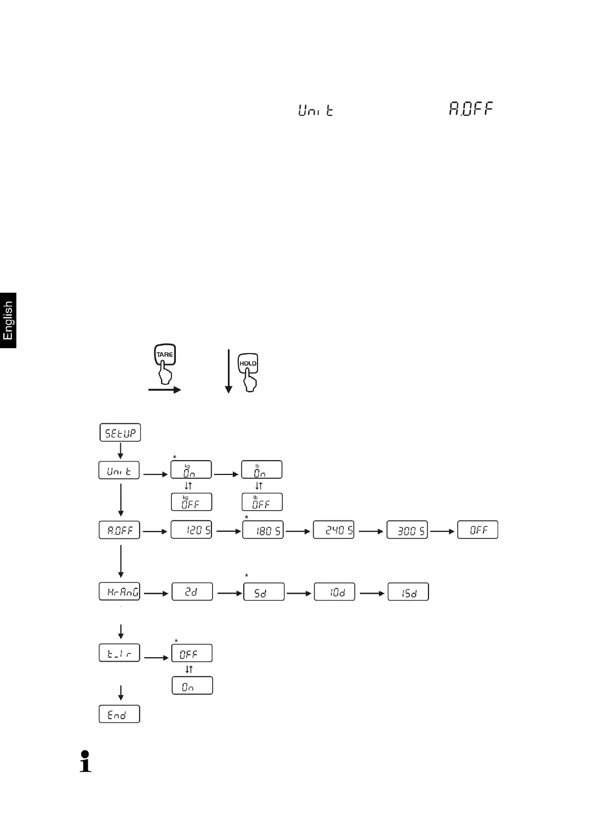 In weighing mode keep TARE button depressed for approx. 3 sec until "SETUP"