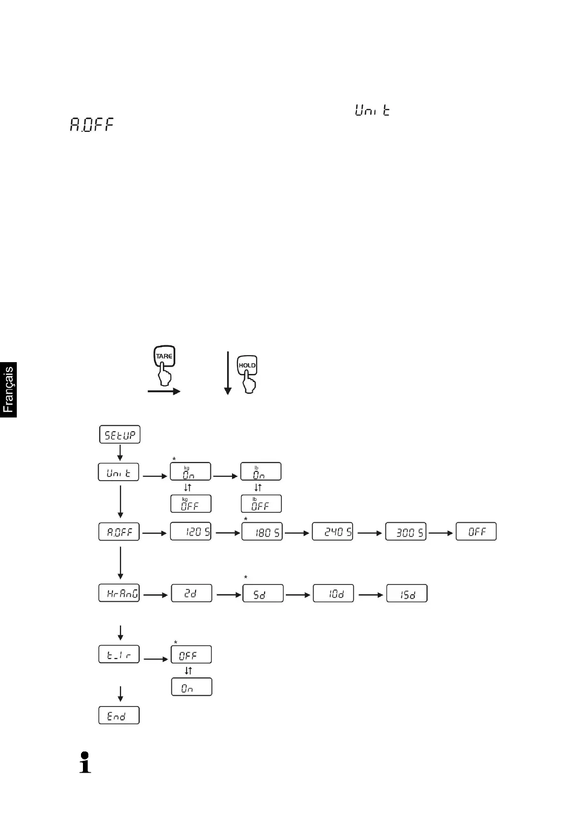 affiché. Sélectionner sur HOLD ou TARE le paramètre voulu. Retourner sur