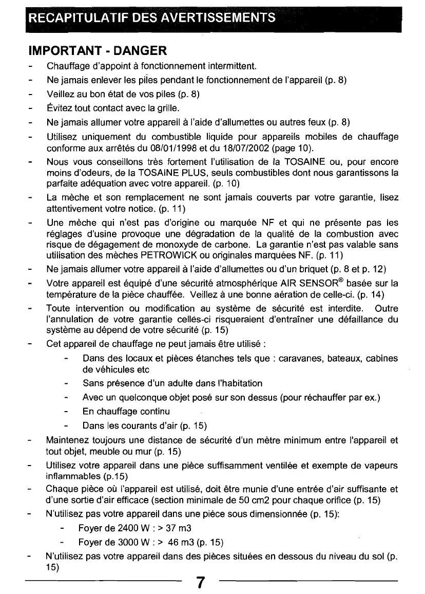 utilisation des mèches PETROWICK ou originales marquées NF. (p. 11)