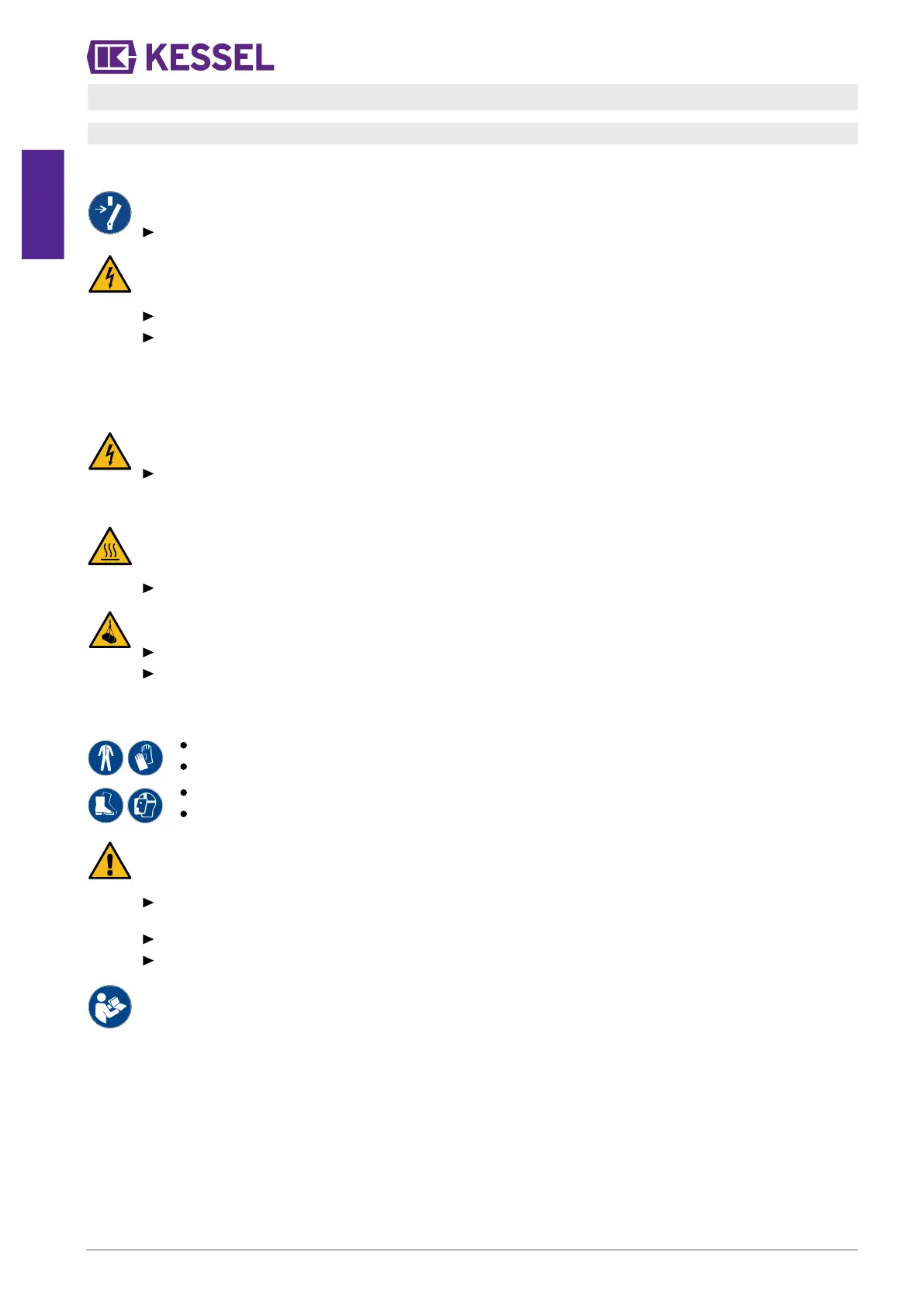 Make sure that the electric cables as well as all other electrical installation components are in a faultless condition. In case of