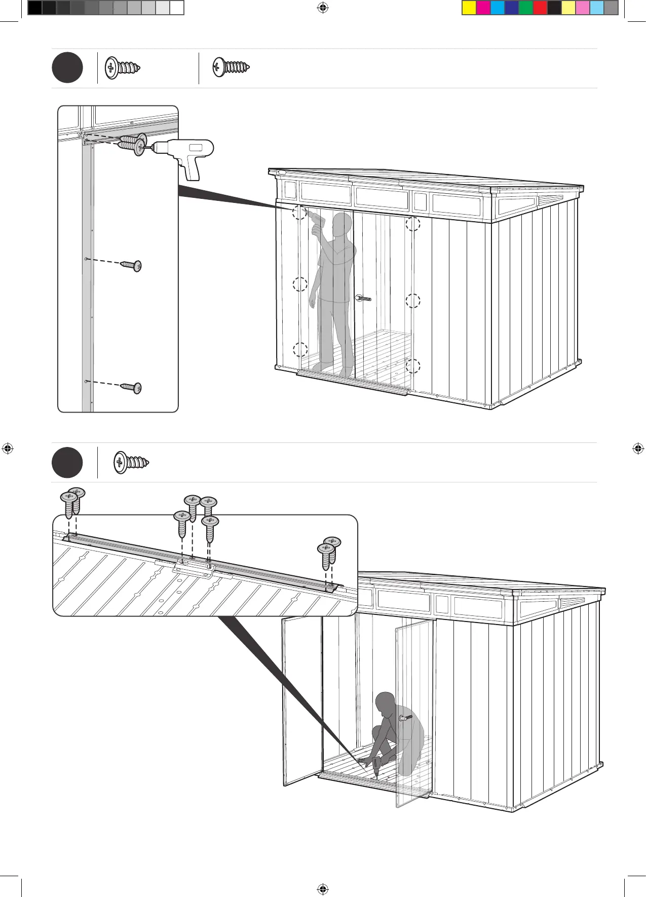 Ancorare la casetta alle fondamenta forando il pavimento nelle posizioni indicate e applicando apposite viti (viti non incluse).