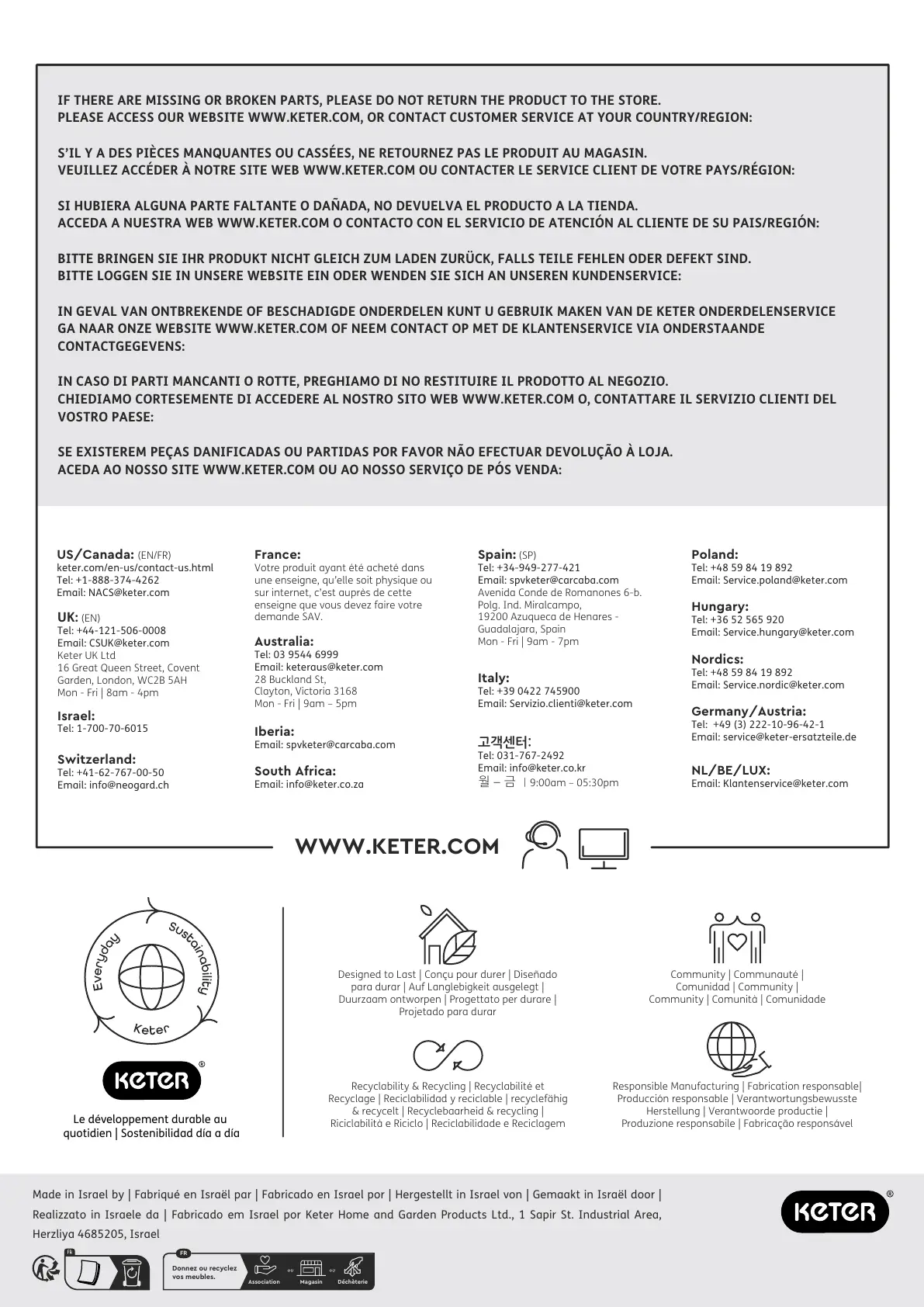 PLEASE ACCESS OUR WEBSITE WWW.KETER.COM, OR CONTACT CUSTOMER SERVICE AT YOUR COUNTRY/REGION: