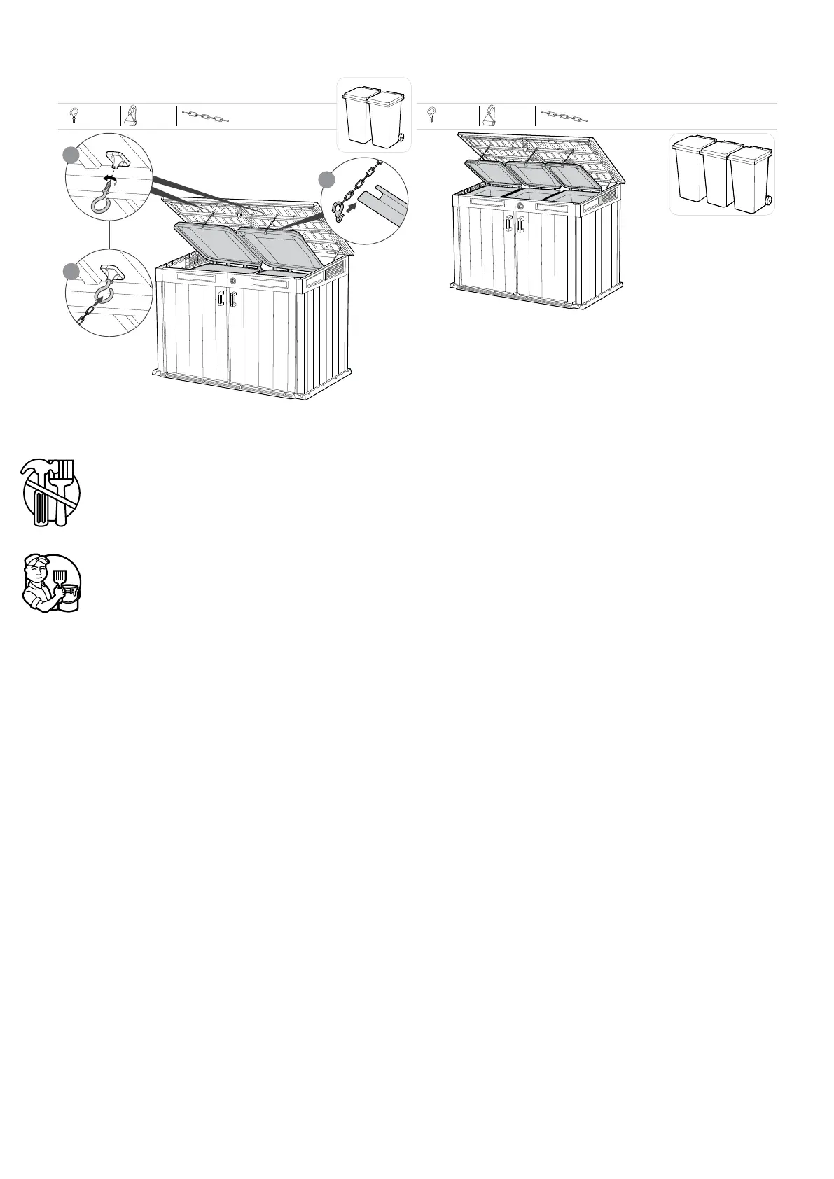 • Ota yhteyttä paikallisiin viranomaisiin tarkistaaksesi, tarvitaanko vajan pystyttämiseen rakennuslupa. | RETNINGSLINJER FOR PLEJE OG SIKKERHED: • Skuret er kun beregnet til opbevaring. Det er ikke designet til beboelse. • Det