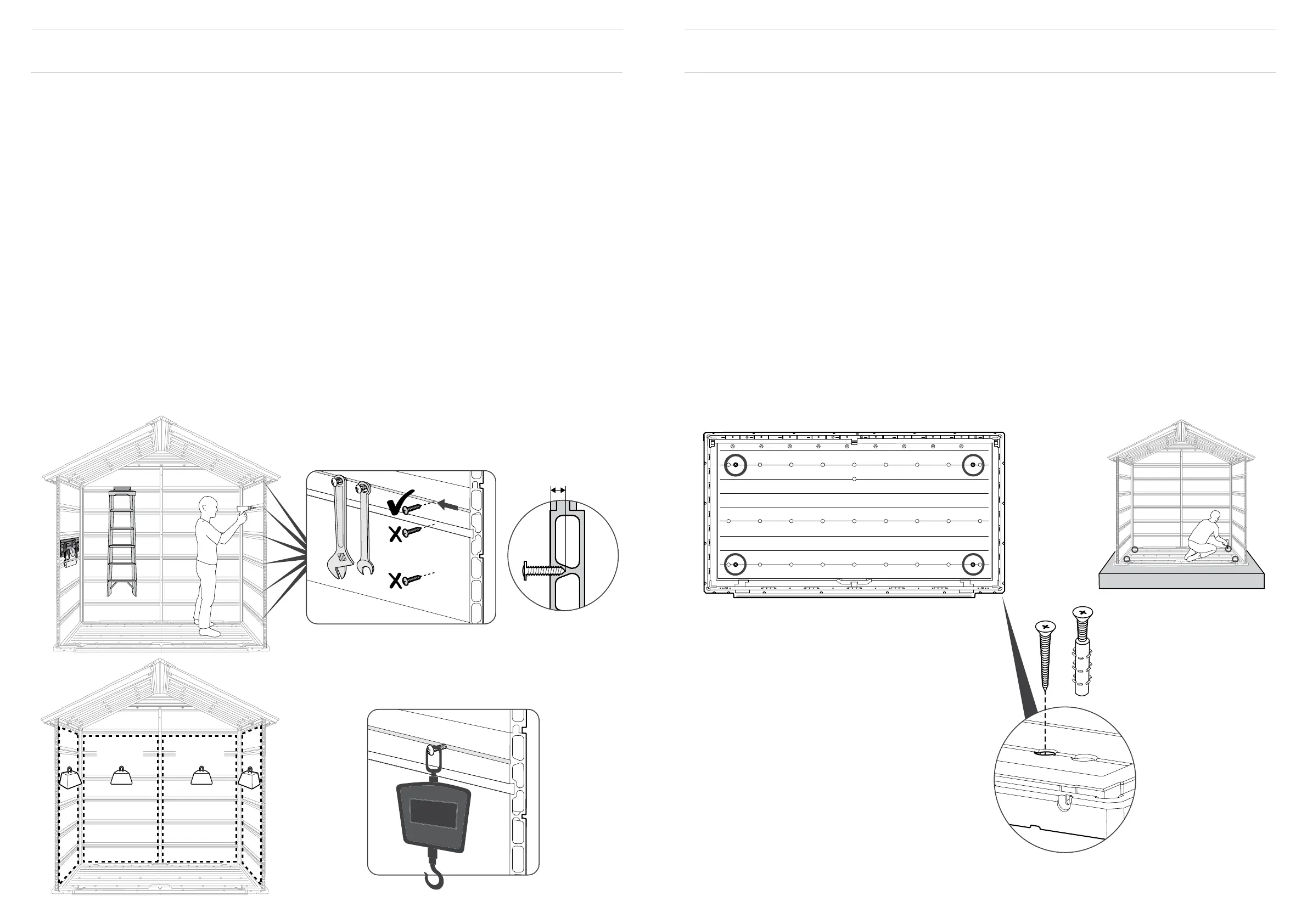 Fissa il deposito attrezzi alle fondamenta facendo dei fori nel pavimento nelle posizioni pre-segnalate ed avvitandolo alle fondamenta utilizzando apposite viti (viti non incluse).