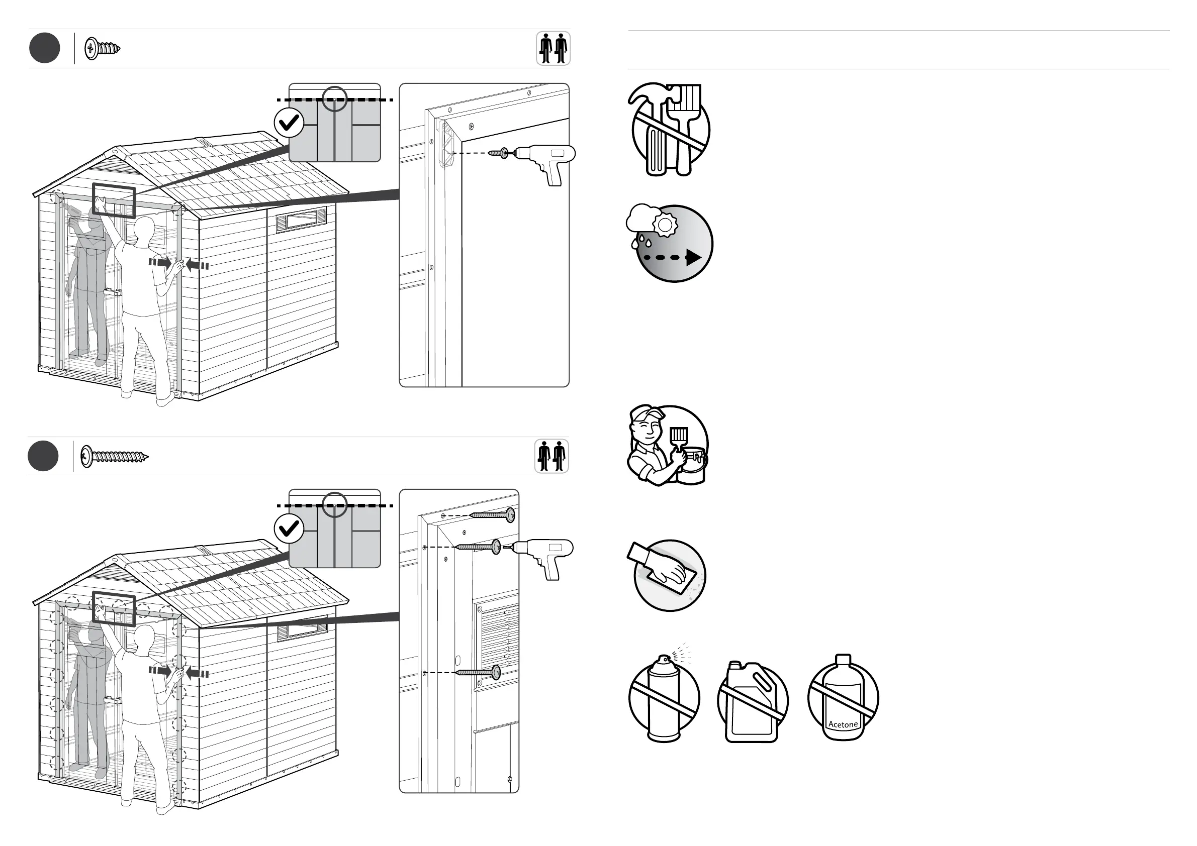 This shed is maintenance free. Paint or varnish are not necessary. Cet abri ne nécessite aucun entretien.