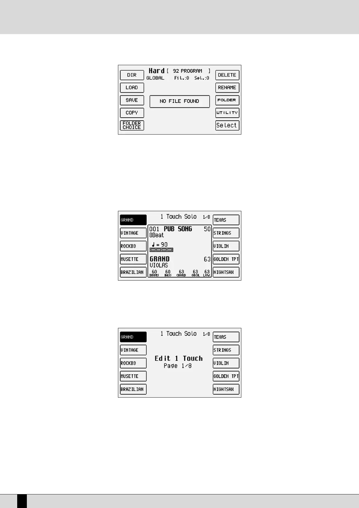 press the 1TOUCH push buttons (LED lit). On the main page the first ten Voices of the list are disdplayed. To display the other seven pages of