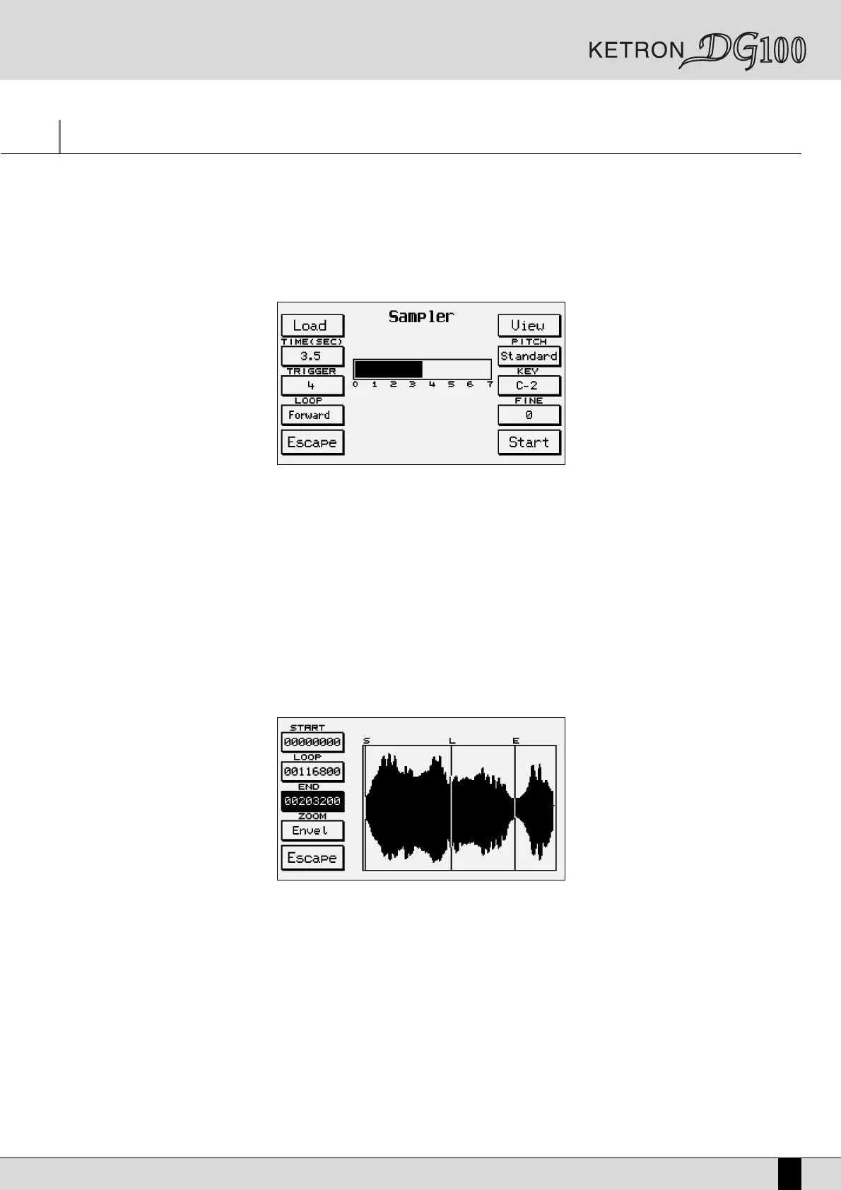 Enable the sampler by pressing the SAMPLER push button. If the RAM/Flash bank has some sounds, the DG100 will warn the user that the