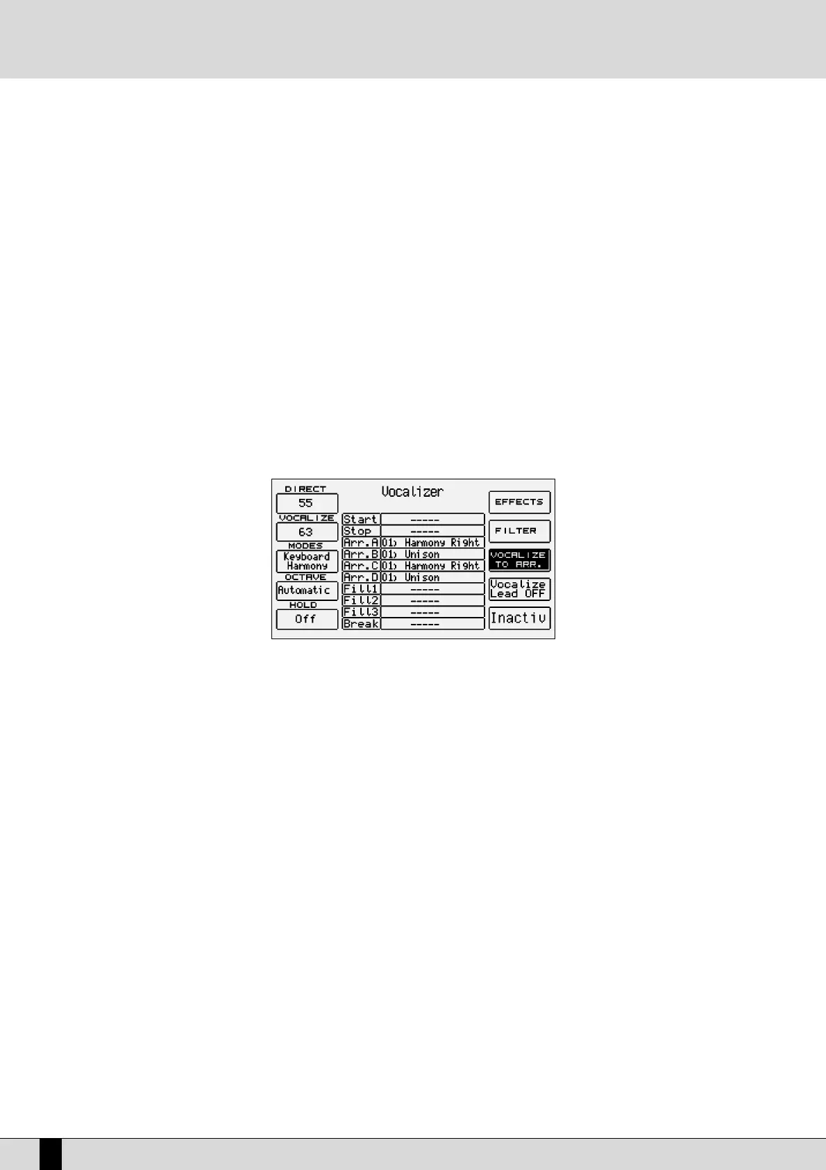 control a similar external unit. “Inactive” deactivates the Vocalizer control via the keyboard, but not via MIDI.