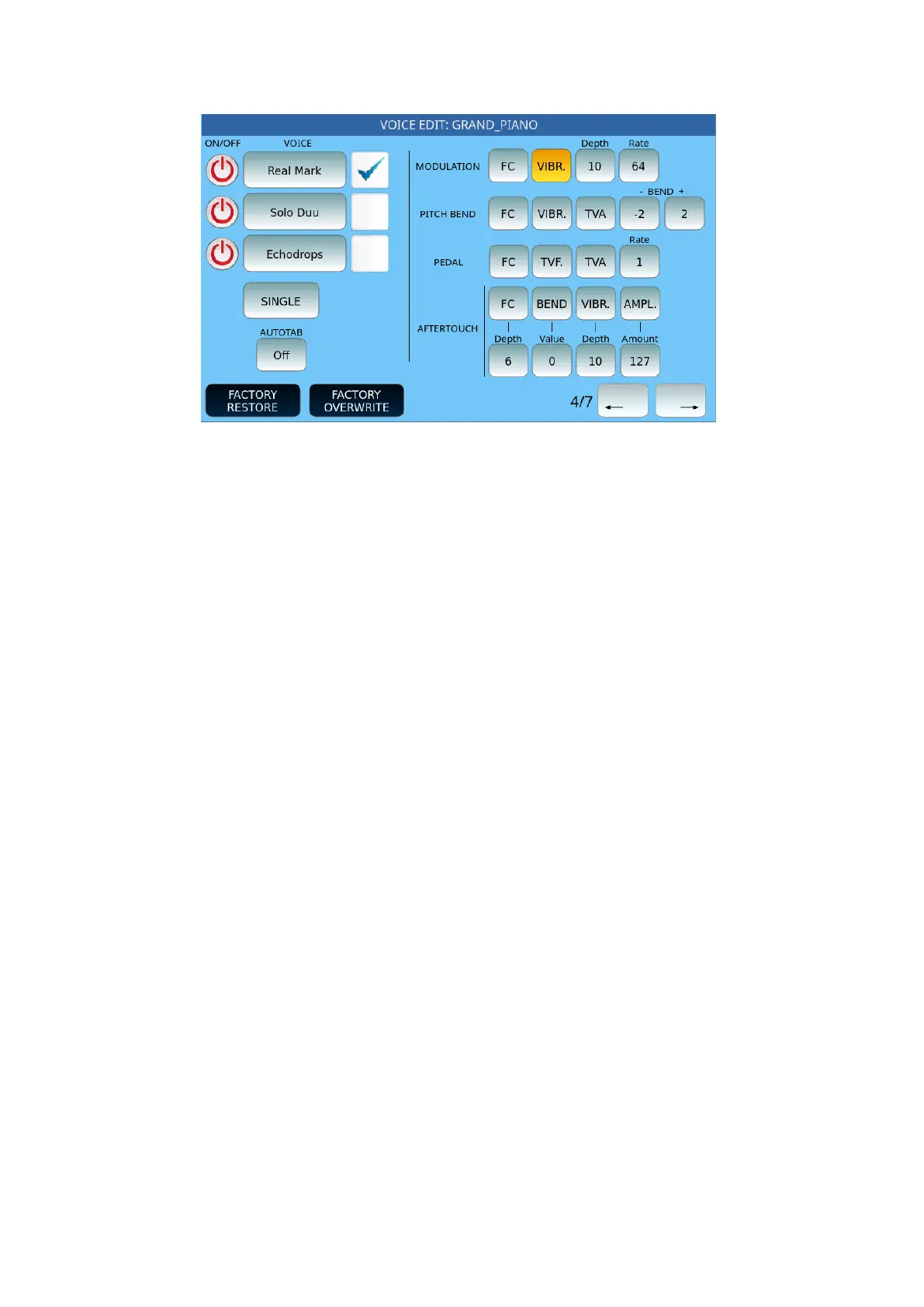 o Depth: Defines the depth of the vibrato by pressing the key (from 3 to