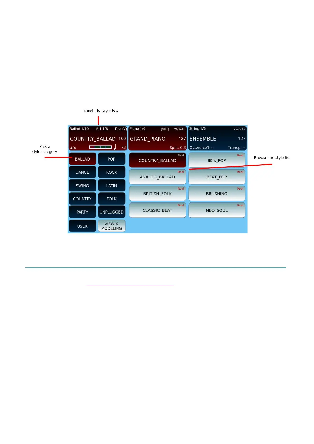 The data scroll areas appear when you press one of boxes: style, Voice 1, Voice 2, Drawbar or