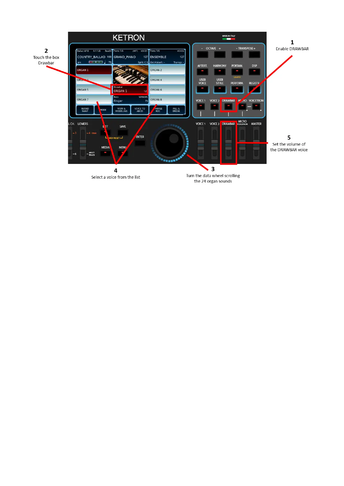 3. Rotate the main data knob and select one of the 24 Drawbar organ sounds by