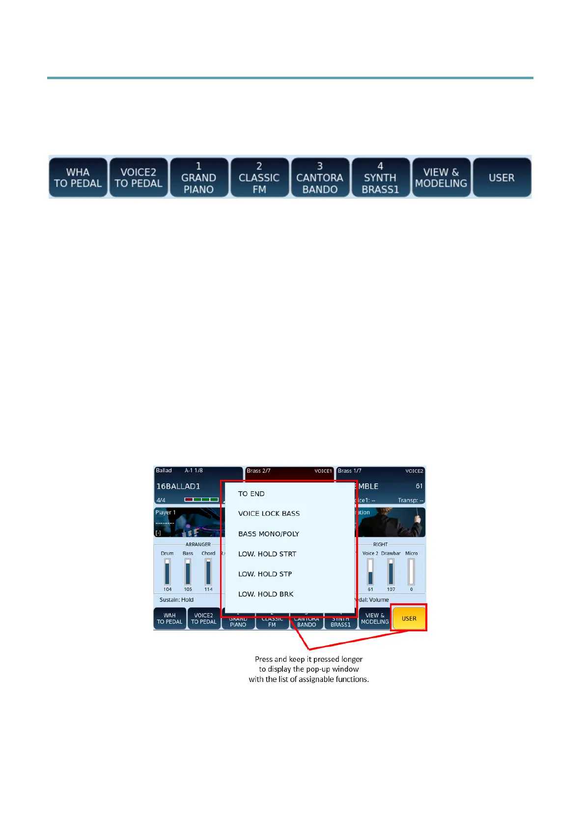 • 1 GRAND PIANO: Instant access to and turning on this voice (favorite voice).