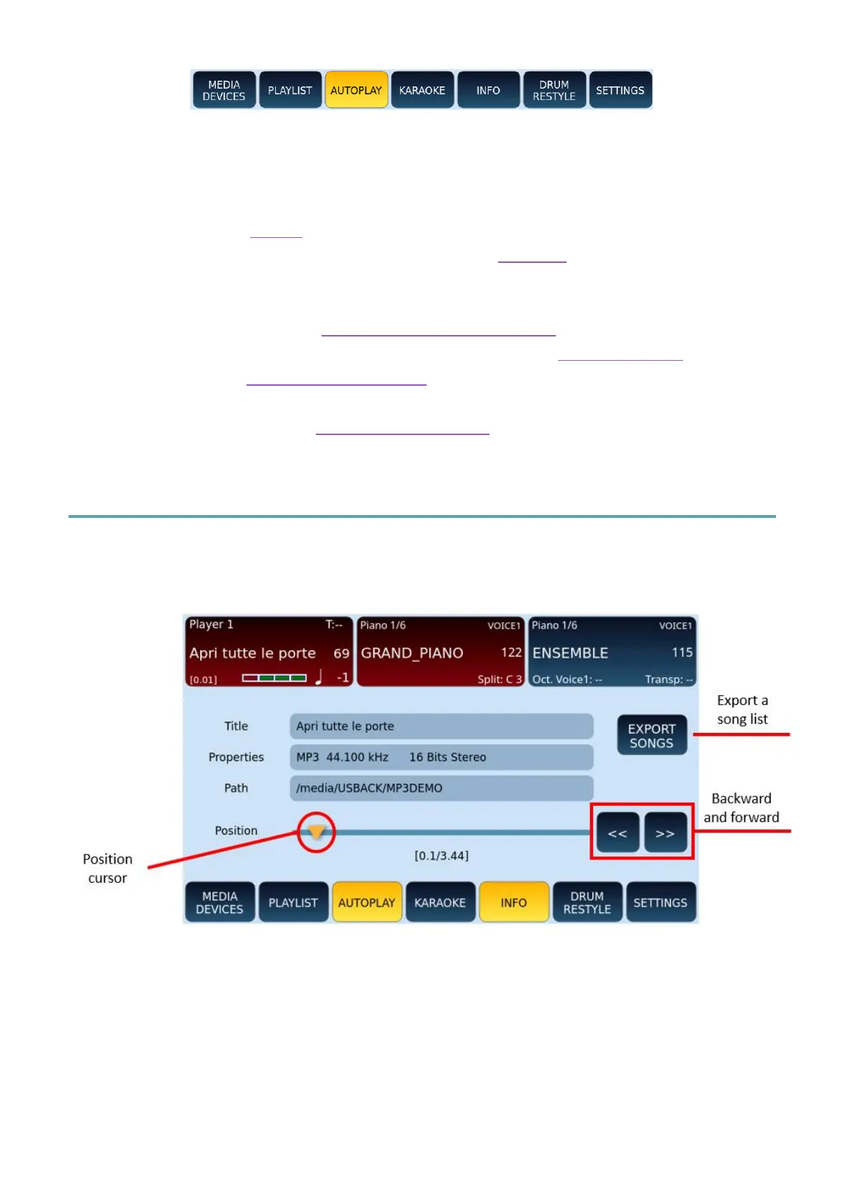 • INFO: View the information of the song being played and control playback.