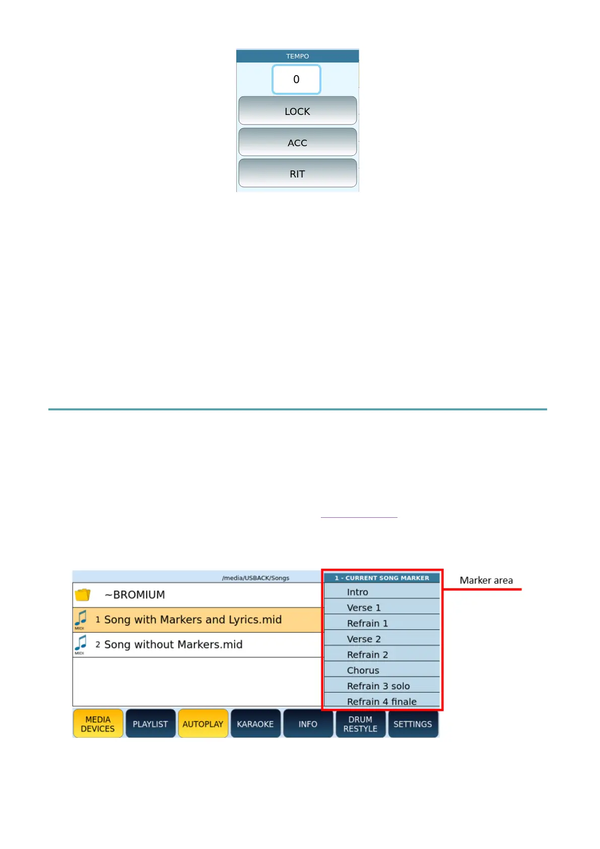 • LOCK: Freezes Tempo between consecutive songs and ignores MIDI Tempo change