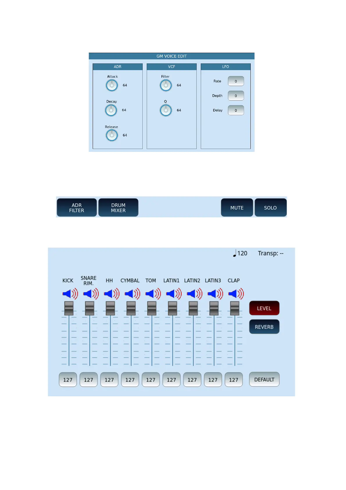 envelope (ADR), the cut and resonance of the filter (VCF) and the frequency, depth and delay