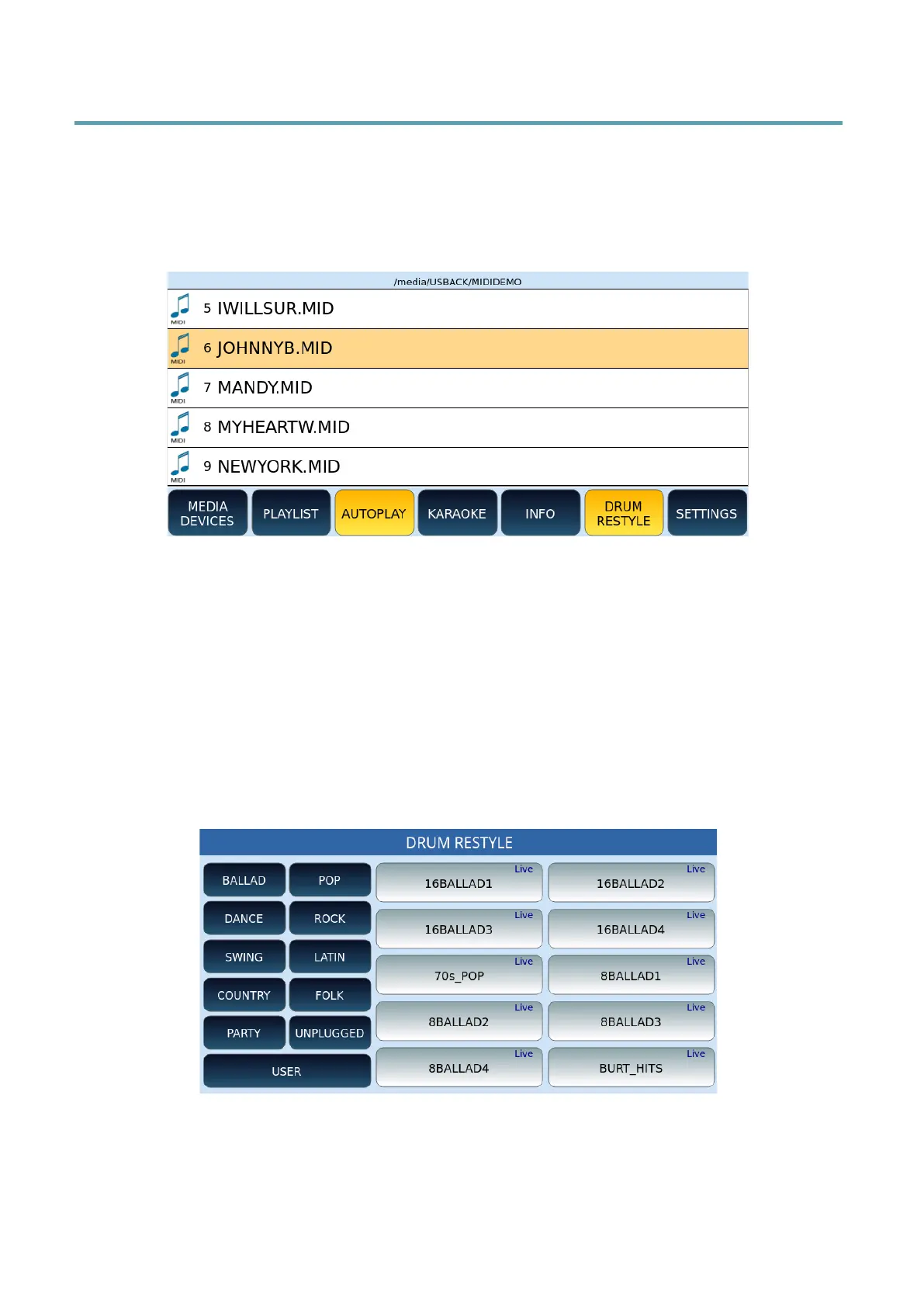 6. As the MIDI file plays, select the style family and, within the selected one, touch