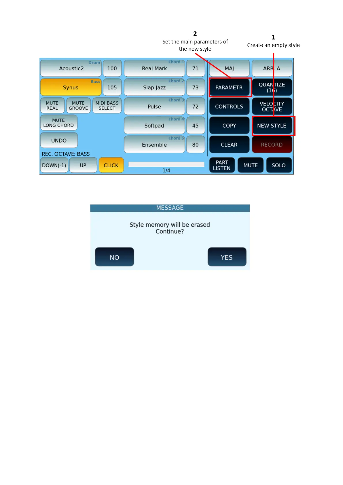 Press the NEW STYLE button on the screen: the system will ask you to confirm the memory