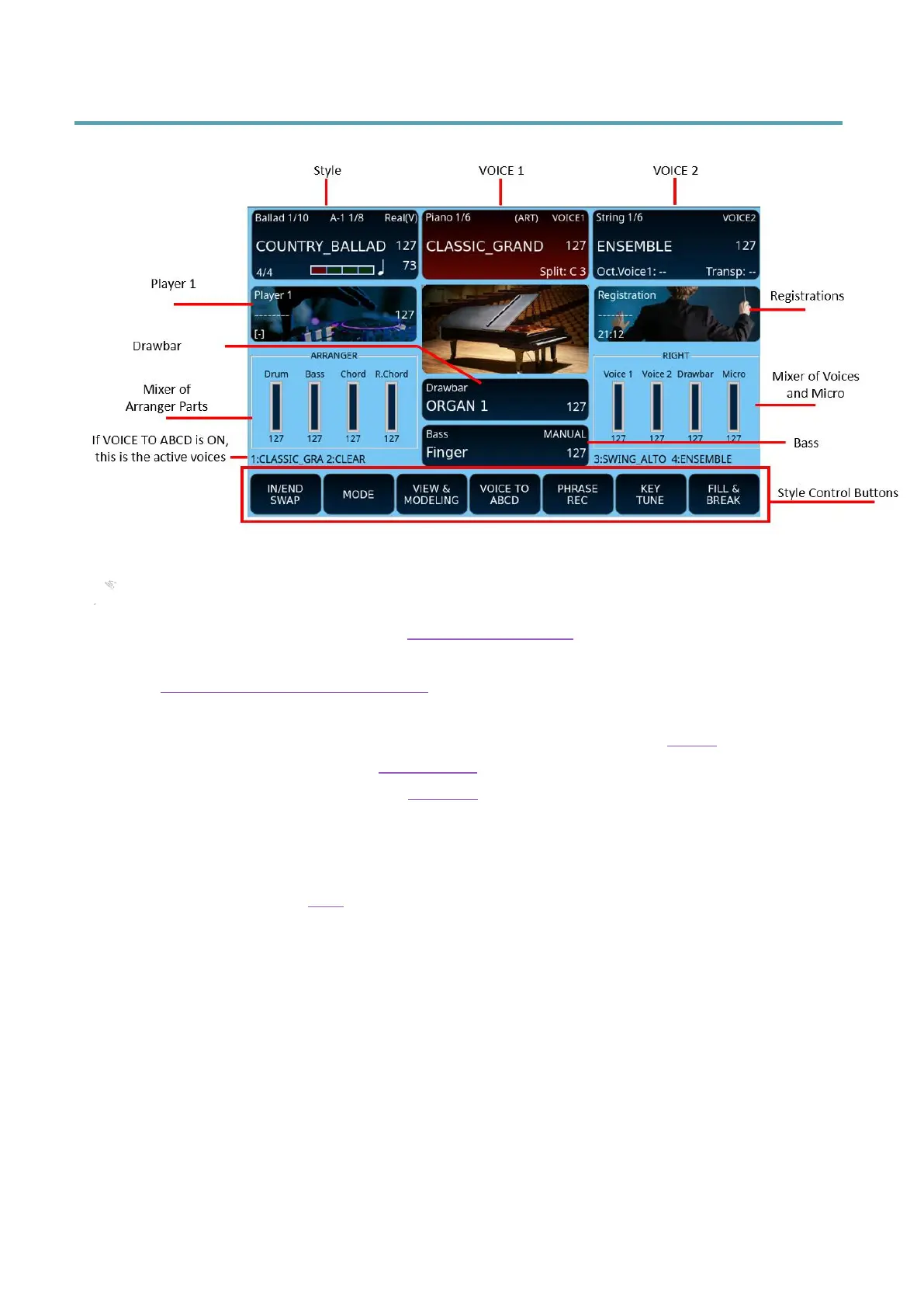 The data scroll areas appear when you press one of boxes: style, Voice 1, Voice 2, Drawbar or