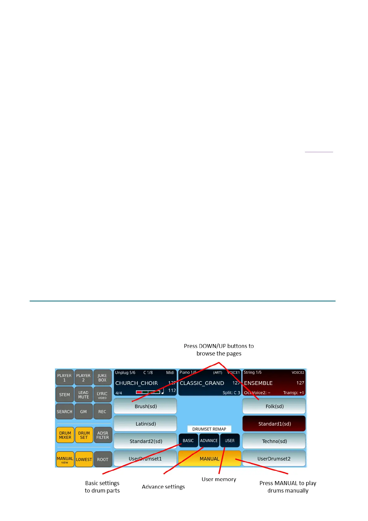 You can access the manual percussive kit control page by pressing the DRUM SET button on