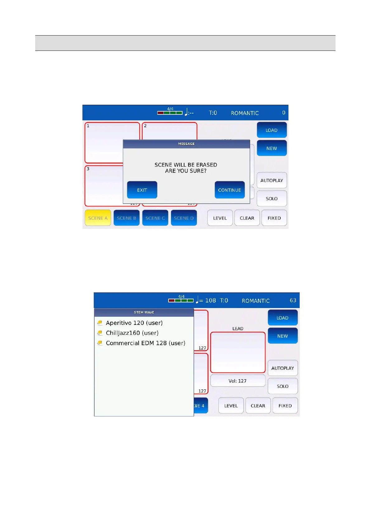 • Tap on the CONTINUE button. All the scenes and the pads will be cleared. Tap on the EXIT
