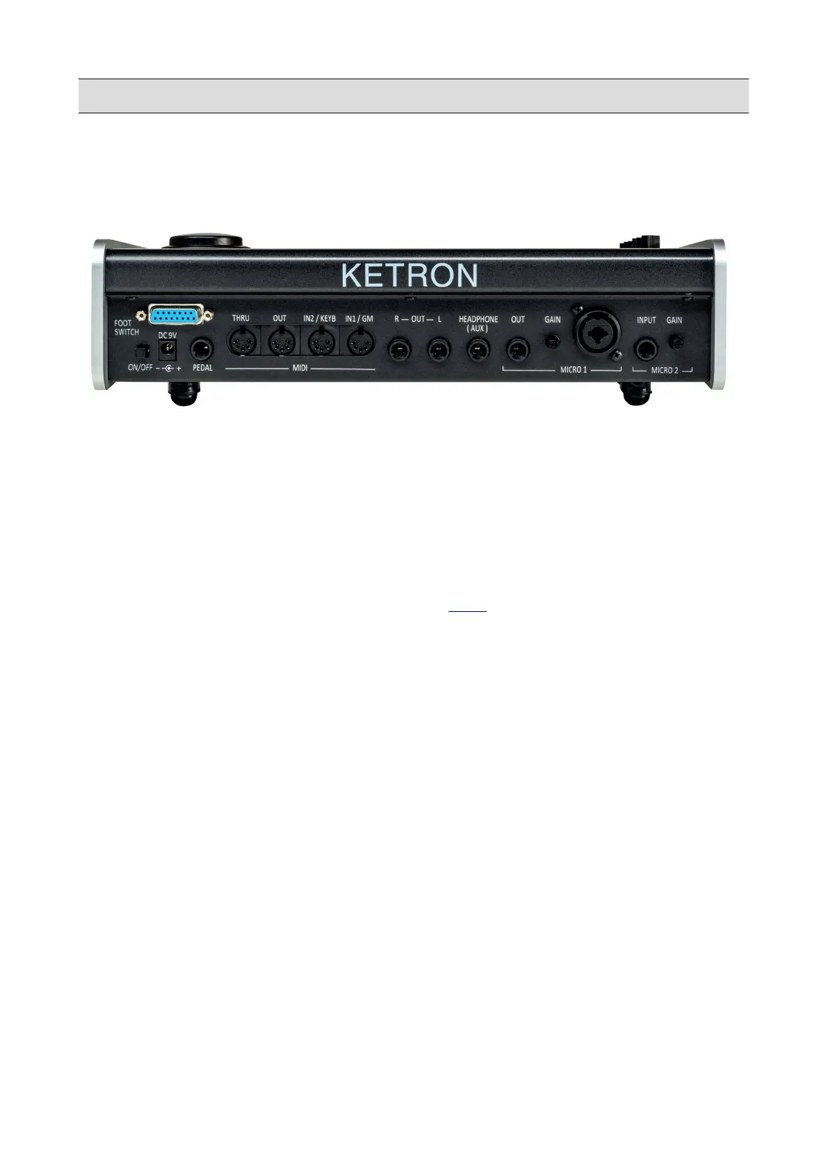 • FOOTSWITCH: use this port to connect the KETRON footswitch controller (optional).