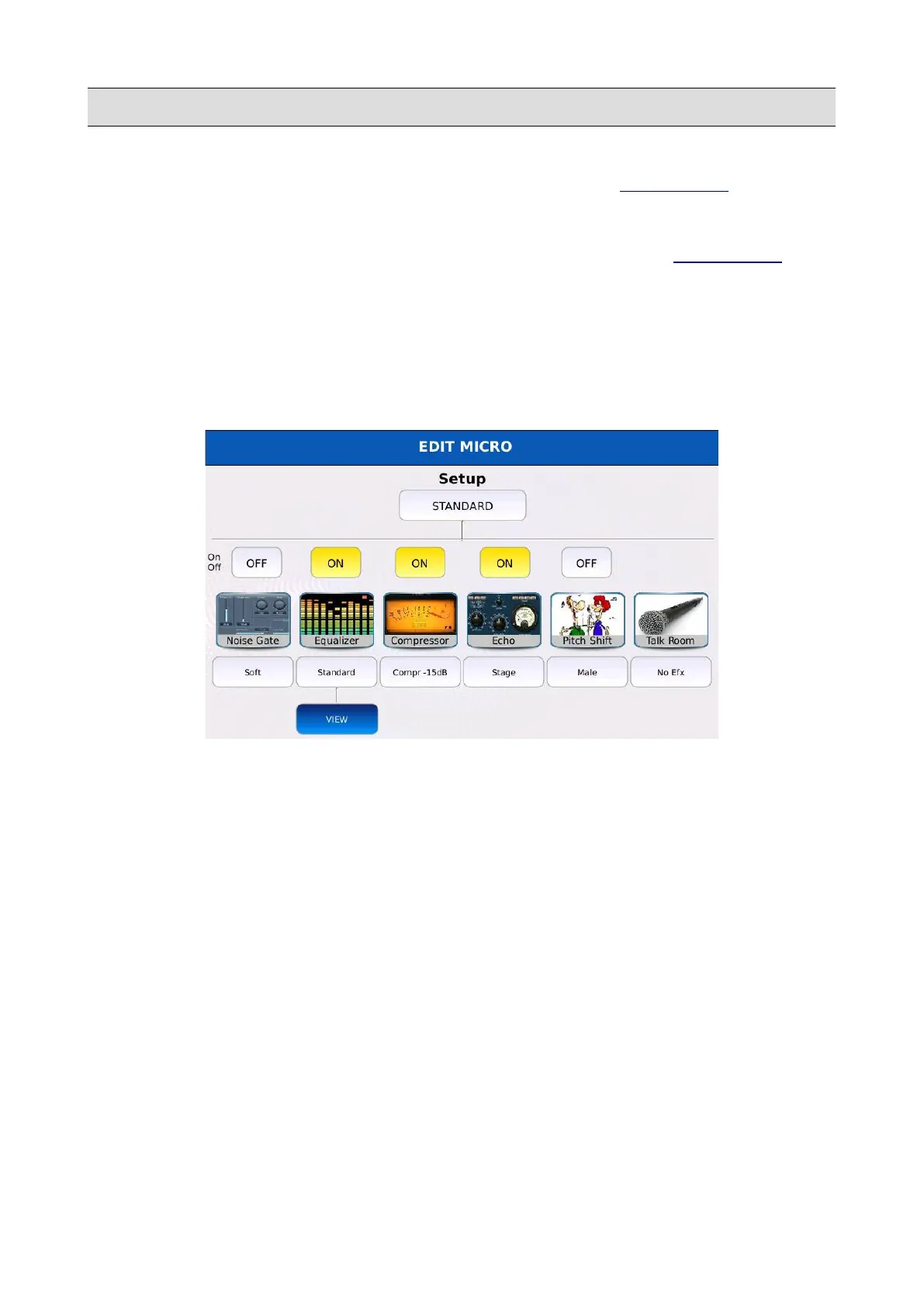 • TALK: tap on the box to select a talk preset between No Efx, Short1 and Short2. Each preset