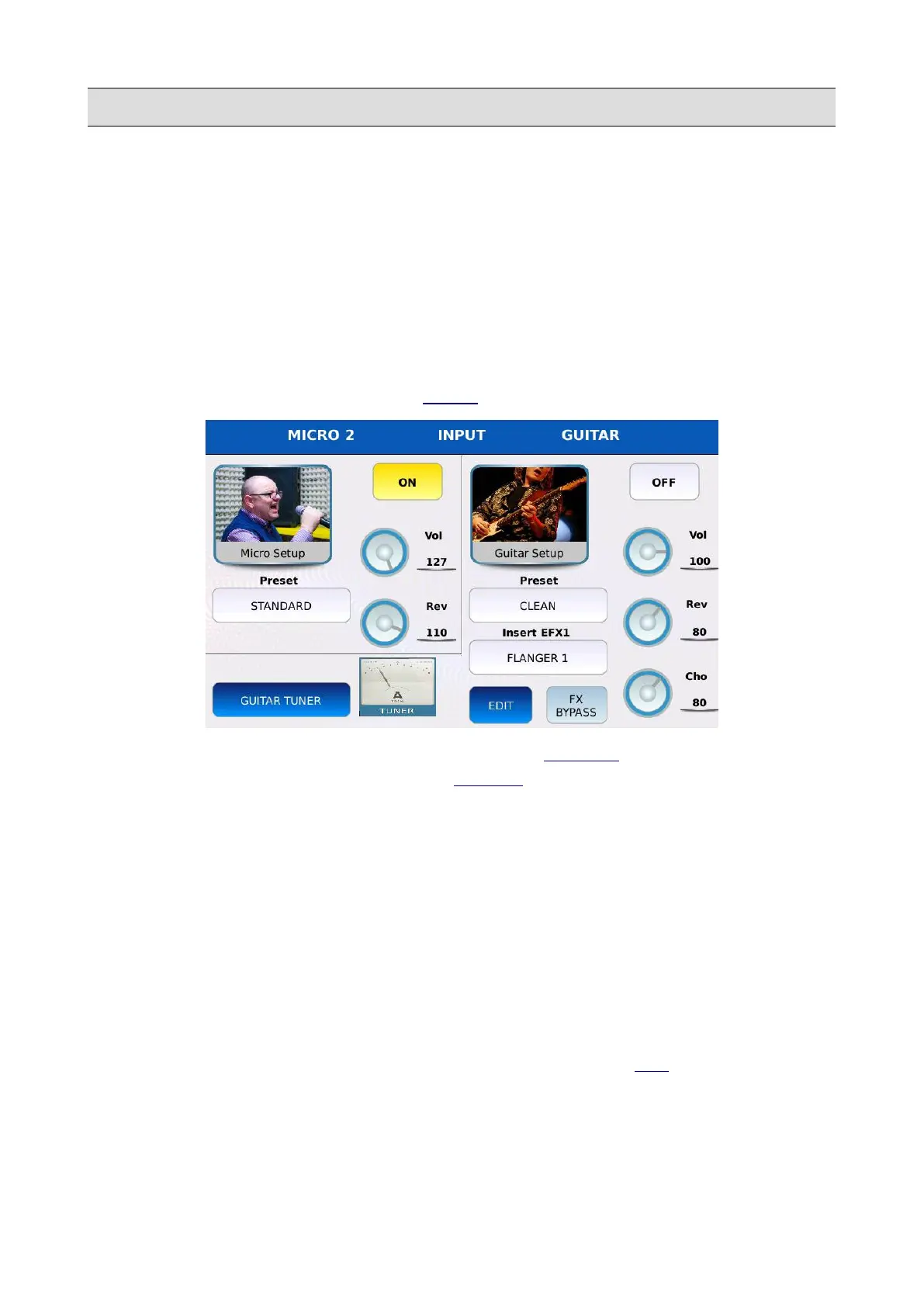microphone settings while the second is labelled GUITAR and displays the guitar settings.