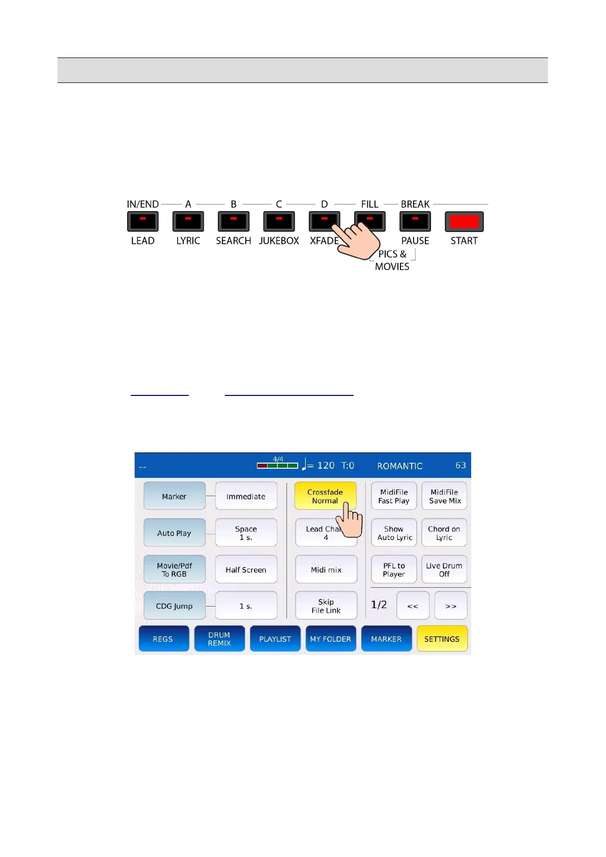 Press XFADE to enable the cross fading between songs. The XFADE button will turn on.