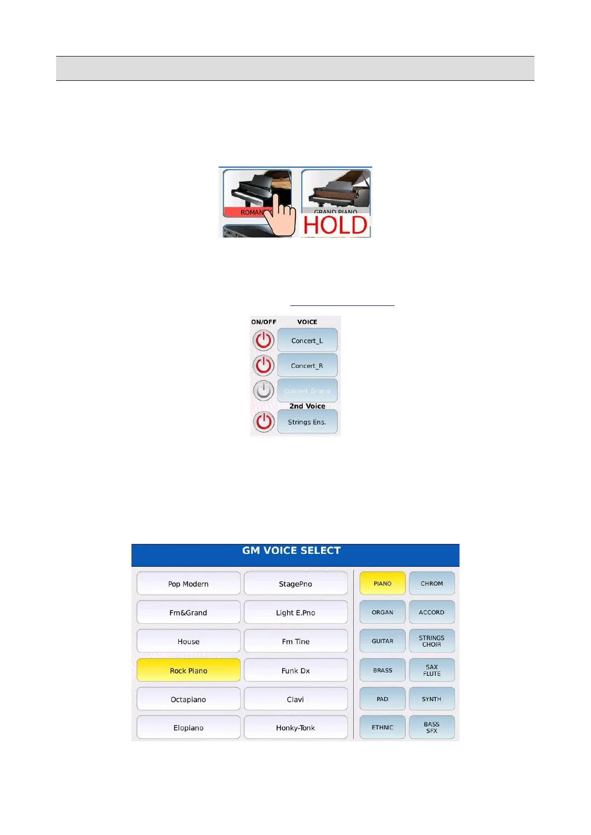 • VOICE: opens the GM VOICE SELECT page to selects the GM sound to be played on that