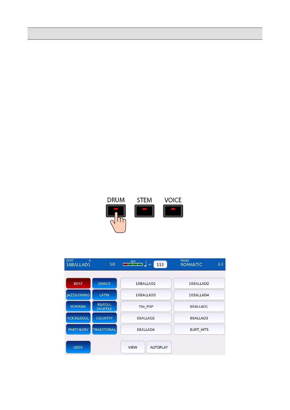 Press DRUM to enter in DRUM mode. The DRUM button led will turn on and the DRUM page