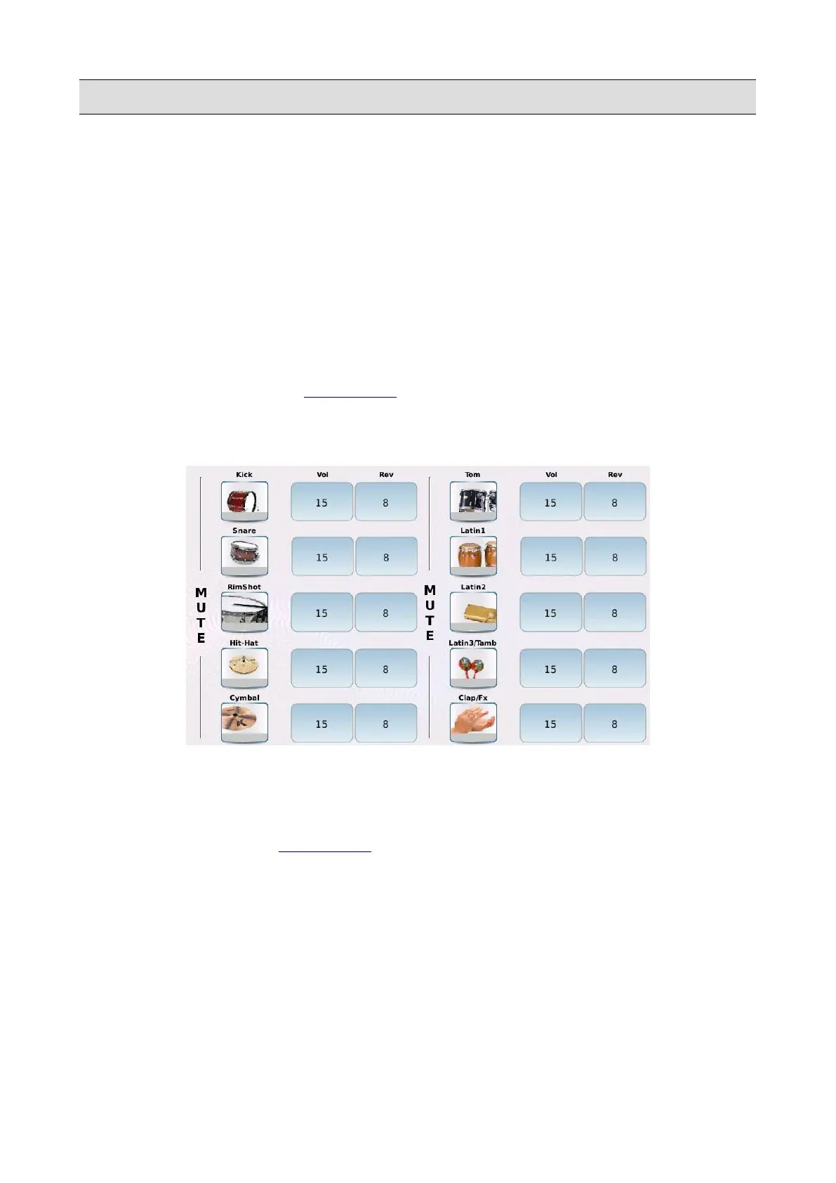 In the DRUMSET MIXER page, are displayed all the pieces of the drum set, along with the volume