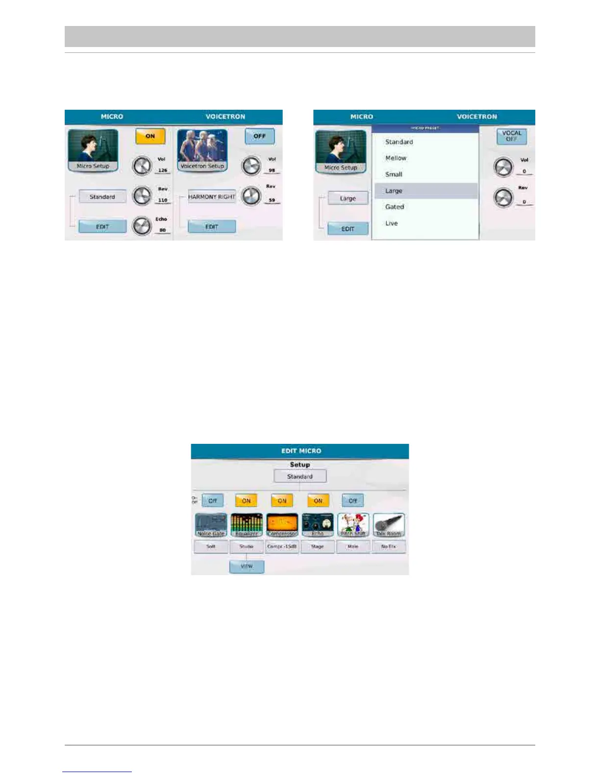 ser ativados ou desativados mediante as teclas virtuais MICRO ON/OFF e VOCAL ON/OFF. A partir da seção MICRO